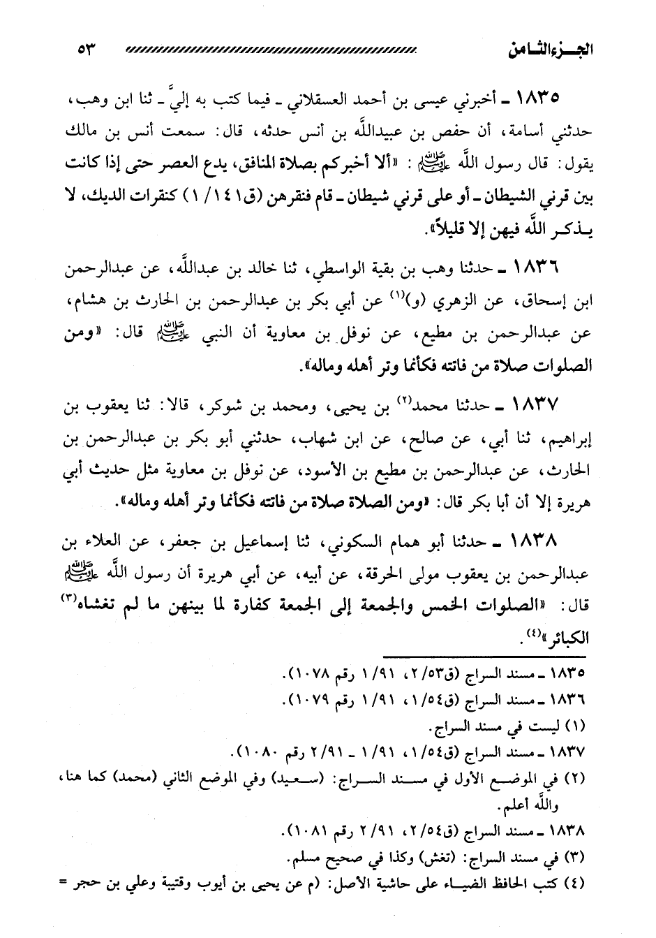 1835- أَخْبَرَنِي عِيسَى بْنُ أَحْمَدَ الْعَسْقَلانِيُّ -فِيمَا كَتَبَ بِهِ إِلَيَّ- ثنا ابْنُ وَهْبٍ، حَدَّثَنِي أُسَامَةُ، أَنَّ حَفْصَ بْنَ عُبَيْدِ اللَّهِ بْنِ أَنَسٍ حَدَّثَهُ، قَالَ: سَمِعْتُ أَنَسَ بْنَ مَالِكٍ يَقُولُ: قال رسول الله صلى الله عليه وسلم: ((أَلا أُخْبِرُكُمْ بِصَلاةِ الْمُنَافِقِ، يَدَعُ الْعَصْرَ حَتَّى إِذَا كَانَتْ بَيْنَ قَرْنَيِ الشَّيْطَانِ -أَوْ عَلَى قرني شيطان- قام فنقرهن كنقرات الديك، لا يذكر الله فِيهِنَّ إِلا قَلِيلا)) .