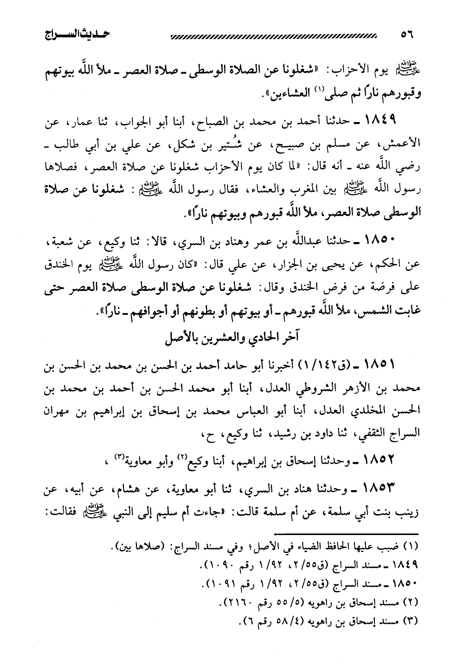 1851- أَخْبَرَنَا أَبُو حَامِدٍ أَحْمَدُ بْنُ الْحَسَنِ بْنِ مُحَمَّدِ بْنِ الْحَسَنِ بْنِ مُحَمَّدِ بْنِ الأَزْهَرِ الشروطي العدل، أبنا أبو محمد الحسن بن أحمد بن محمد بن الحسن المخلدي العدل، أبنا أَبُو الْعَبَّاسِ مُحَمَّدُ بْنُ إِسْحَاقَ بْنِ إِبْرَاهِيمَ بْنِ مِهْرَانَ السَّرَّاجُ الثَّقَفِيُّ، ثنا دَاوُدُ بْنُ رُشَيْدٍ، ثنا وَكِيعٌ، ح،