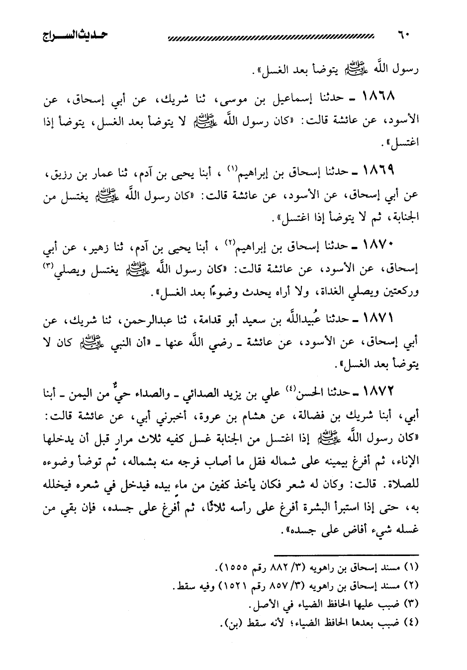 1871- حَدَّثَنَا عُبَيْدُ اللَّهِ بْنُ سَعِيدٍ أَبُو قُدَامَةَ، ثنا عَبْدُ الرَّحْمَنِ، ثنا شَرِيكٌ، عَنْ أَبِي إِسْحَاقَ، عَنِ الأَسْوَدِ، عَنْ عَائِشَةَ -رَضِيَ اللَّهُ عَنْهَا- ((أَنَّ النَّبِيَّ صَلَّى اللَّهُ عَلَيهِ وَسَلَّمَ كَانَ لا يَتَوَضَّأُ بَعْدَ الْغُسْلِ)) .