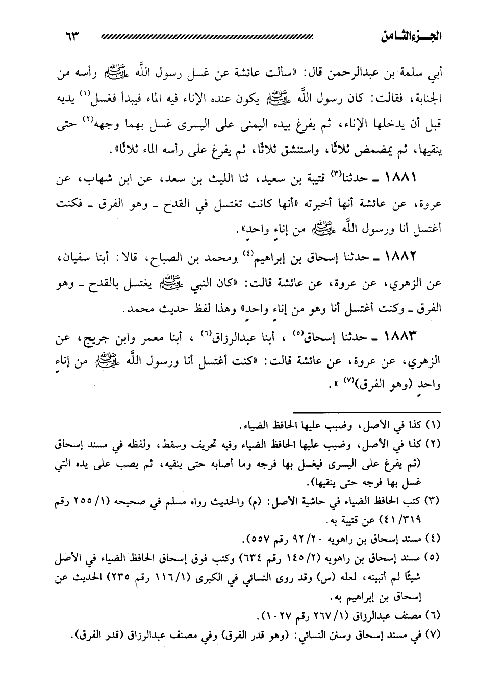 1883- حدثنا إسحاق، أبنا عبد الرزاق، أبنا مَعْمَرٌ وَابْنُ جُرَيْجٍ، عَنِ الزُّهْرِيِّ، عَنْ عُرْوَةَ، عَنْ عَائِشَةَ قَالَتْ: ((كُنْتُ أَغْتَسِلُ أَنَا وَرَسُولُ الله صلى الله عليه وسلم من إناءٍ واحدٍ (وَهُوَ الْفَرَقُ)) ) .