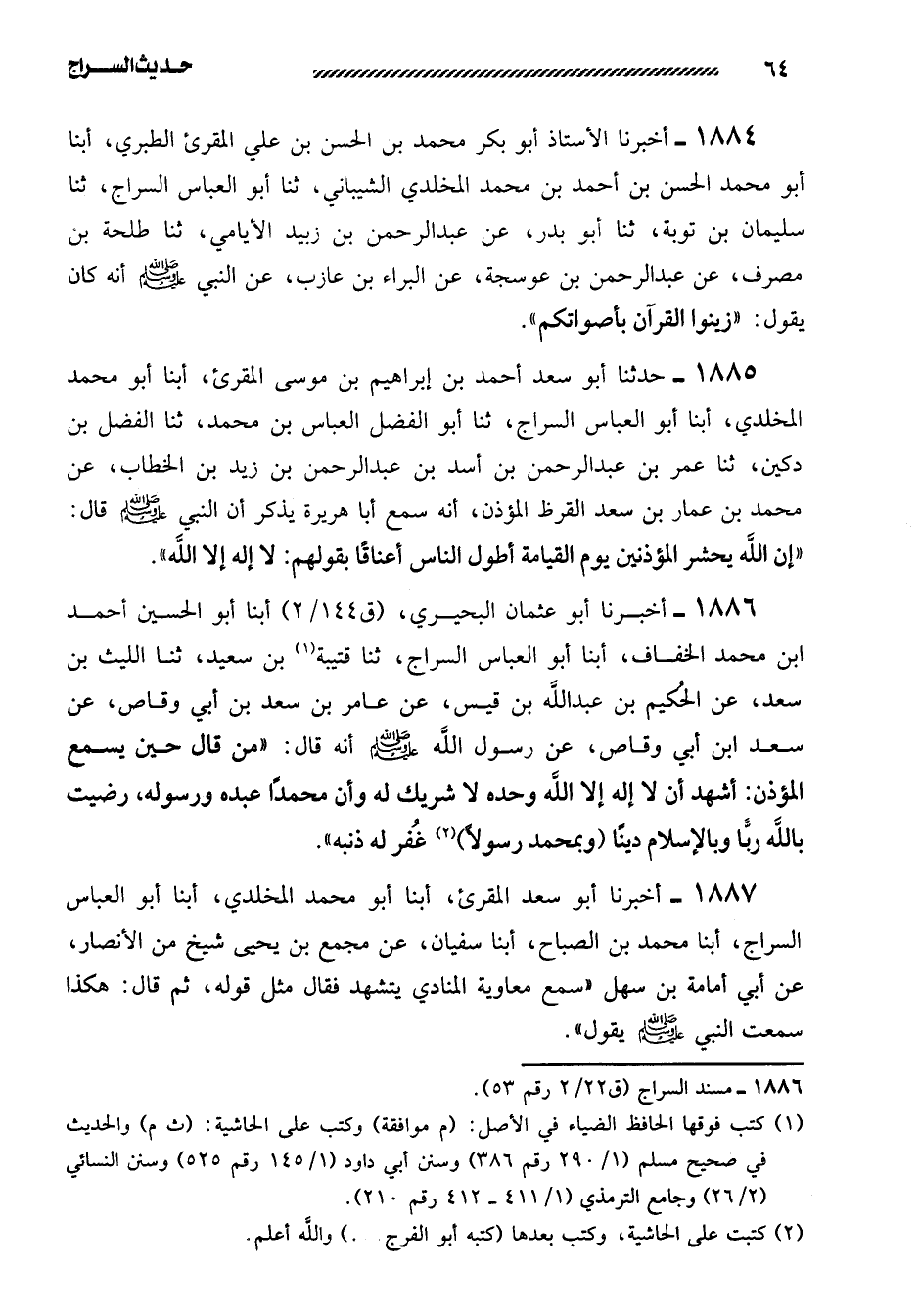 1884- أخبرنا الأستاذ أبو بكر محمد بن الحسن بن علي المقرئ الطبري، أبنا أبو محمد الحسن بن أحمد بن محمد الْمَخْلَدِيُّ الشَّيْبَانِيُّ، ثنا أَبُو الْعَبَّاسِ السَّرَّاجُ، ثنا سُلَيْمَانُ بْنُ تَوْبَةَ، ثنا أَبُو بَدْرٍ، عَنْ عَبْدِ الرَّحْمَنِ بْنِ زُبَيْدٍ الإِيَامِيِّ، ثنا طَلْحَةُ بن مصرف، عن عبد الرحمن بن عوسجة، عَنِ الْبَرَاءِ بْنِ عَازِبٍ، عَنِ النَّبِيِّ صَلَّى اللَّهُ عَلَيهِ وَسَلَّمَ أَنَّهُ كَانَ يَقُولُ: ((زَيِّنُوا القرآن بأصواتكم)) .