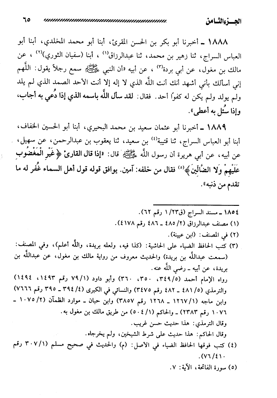 1888- أخبرنا أبو بكر بن الحسن المقرئ، أبنا أبو محمد المخلدي، أبنا أَبُو الْعَبَّاسِ السَّرَّاجُ، ثنا زُهَيْرُ بْنُ مُحَمَّدٍ، ثنا عبد الرزاق، أبنا (سُفْيَانُ الثَّوْرِيُّ) ، عَنْ مَالِكِ بْنِ مِغْوَلٍ، عَنْ أَبِي بُرْدَةَ، عَنْ أَبِيهِ ((أَنَّ النَّبِيَّ صَلَّى اللَّهُ عَلَيهِ وَسَلَّمَ سَمِعَ رَجُلا يَقُولُ: اللَّهُمَّ إِنِّي أَسْأَلُكَ بِأَنِّي أَشْهَدُ أَنَّكَ أَنْتَ اللَّهُ الَّذِي لا إِلَهَ إِلا أَنْتَ الأَحَدُ الصَّمَدُ الَّذِي لَمْ يَلِدْ وَلَمْ يُولَدْ وَلَمْ يَكُنْ لَهُ كُفُوًا أَحَدٌ. فَقَالَ: لَقَدْ سَأَلَ اللَّهَ بِاسْمِهِ الَّذِي إِذَا دُعِيَ بِهِ أَجَابَ، وَإِذَا سُئِلَ بِهِ أَعْطَى)) .