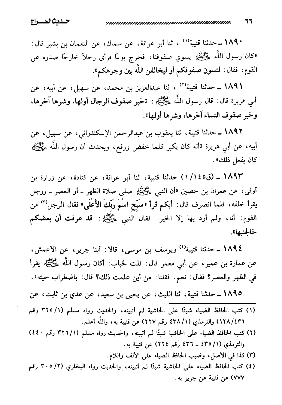 1890- حَدَّثَنَا قُتَيْبَةُ، ثنا أَبُو عَوَانَةَ، عَنْ سِمَاكٍ، عَنِ النُّعْمَانِ بْنِ بَشِيرٍ قَالَ: ((كَانَ رَسُولُ اللَّهِ صَلَّى اللَّهُ عَلَيهِ وَسَلَّمَ يُسَوِّي صُفُوفَنَا، فَخَرَجَ يَوْمًا فَرَأَى رَجُلا خَارِجًا صَدْرُهُ عَنِ الْقَوْمِ، فَقَالَ: لَتُسَوُّنَّ صُفُوفَكُمْ أَوْ لَيُخَالِفَنَّ اللَّهُ بين وجوهكم)) .
