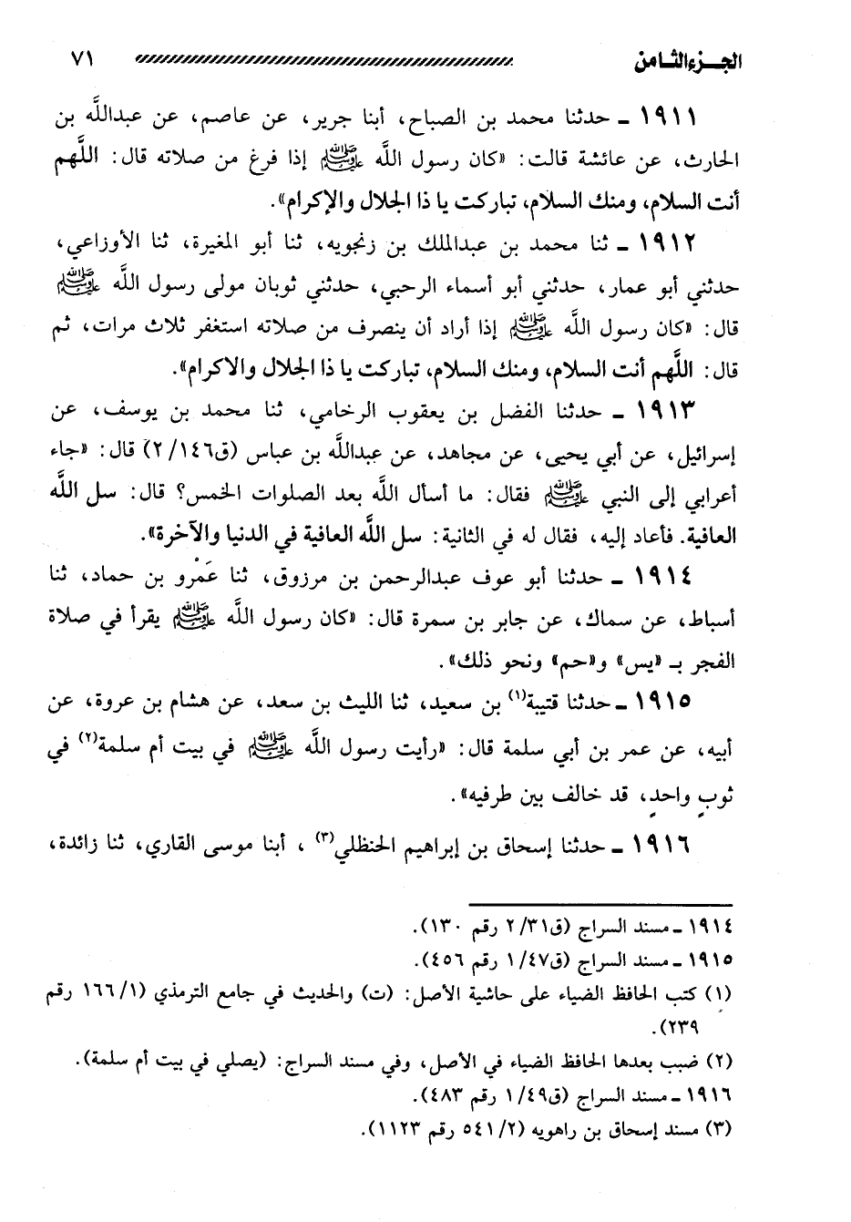 1911- حدثنا محمد بن الصباح، أبنا جَرِيرٌ، عَنْ عَاصِمٍ، عَنْ عَبْدِ اللَّهِ بْنِ الحارث، عن عائشة قالت: ((كان رسول الله صلى الله عليه وسلم إذا فرغ من صَلاتِهِ قَالَ: اللَّهُمَّ أَنْتَ السَّلامُ، وَمِنْكَ السَّلامُ، تَبَارَكْتَ يَا ذَا الْجَلالِ وَالإِكْرَامِ)) .
