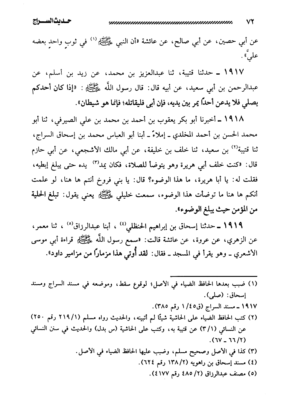 1918- أَخْبَرَنَا أَبُو بَكْرٍ يَعْقُوبُ بْنُ أَحْمَدَ بْنِ مُحَمَّدِ بْنِ عَلِيٍّ الصَّيْرَفِيُّ: ثنا أَبُو مُحَمَّدٍ الحسن بن أحمد المخلدي -إملاءً- أبنا أَبُو الْعَبَّاسِ مُحَمَّدُ بْنُ إِسْحَاقَ السَّرَّاجُ، ثنا قُتَيْبَةُ بْنُ سَعِيدٍ، ثنا خَلَفُ بْنُ خَلِيفَةَ، عن أبي مالك الأشجعي، عن أبي حازم قَالَ: ((كُنْتُ خَلْفَ أَبِي هُرَيْرَةَ وَهُوَ يَتَوَضَّأُ لِلصَّلاةِ، فَكَانَ يَمُدُّ يَدَهُ حَتَّى يَبْلُغَ إِبْطَيْهِ، فَقُلْتُ لَهُ: يَا أَبَا هُرَيْرَةَ، مَا هَذَا الوضوء؟ قال: يا بني فروخ أنتم ها هنا، لو علمت أنكم ها هنا ما توضأت هذا الوضوء، سَمِعْتُ خَلِيلِي صَلَّى اللَّهُ عَلَيْهِ وَسَلَّمَ يَعْنِي يَقُولُ: تَبْلُغُ الْحِلْيَةُ مِنَ الْمُؤْمِنِ حَيْثُ يَبْلُغُ الوضوء)) .