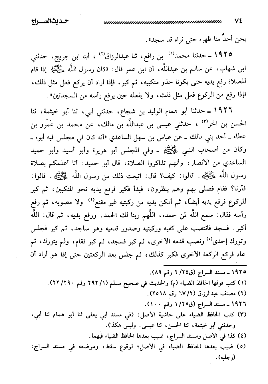 1925- حَدَّثَنَا مُحَمَّدُ بْنُ رَافِعٍ، ثنا عَبْدُ الرَّزَّاقِ، أبنا ابْنُ جُرَيْجٍ، حَدَّثَنِي ابْنُ شِهَابٍ، عَنْ سَالِمِ بْنِ عَبْدِ اللَّهِ، أَنَّ ابْنَ عُمَرَ قَالَ: ((كان رسول الله صلى الله عليه وسلم إِذَا قَامَ لِلصَّلاةِ رَفَعَ يَدَيْهِ حَتَّى يَكُونَا حَذْوَ مَنْكِبَيْهِ، ثُمَّ كَبَّرَ، فَإِذَا أَرَادَ أَنْ يَرْكَعَ فَعَلَ مِثْلَ ذَلِكَ، فَإِذَا رَفَعَ مِنَ الرُّكُوعِ فَعَلَ مِثْلَ ذَلِكَ، وَلا يَفْعَلُهُ حِينَ يَرْفَعُ رَأْسَهُ مِنَ السَّجْدَتَيْنِ)) .