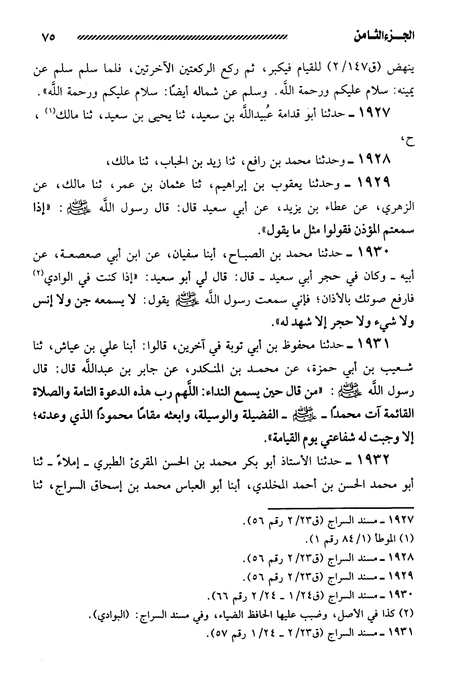 1930- حدثنا محمد بن الصباح، أبنا سفيان، عن ابن أبي صعصعة، عن أبيه -وَكَانَ فِي حِجْرِ أَبِي سَعِيدٍ- قَالَ: قَالَ لِي أَبُو سَعِيدٍ: ((إِذَا كُنْتَ فِي الْوَادِي فَارْفَعْ صَوْتَكَ بِالأَذَانِ؛ فَإِنِّي سَمِعْتُ رَسُولَ اللَّهِ صَلَّى اللَّهُ عَلَيْهِ وَسَلَّمَ يَقُولُ: لا يَسْمَعُهُ جِنٌّ وَلا إِنْسٌ وَلا شَيْءٌ وَلا حَجَرٌ إِلا شَهِدَ لَهُ)) .