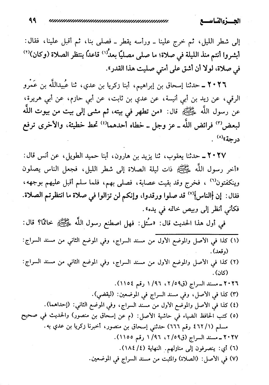 2027- حدثنا يعقوب، ثنا يزيد بن هارون، أبنا حُمَيْدٌ الطَّوِيلُ، عَنْ أَنَسٍ قَالَ: ((أَخَّرَ رَسُولُ الله صلى الله عليه وسلم ذات ليلة الصَّلاةَ إِلَى شَطْرِ اللَّيْلِ، فَجَعَل النَّاسُ يُصَلُّونَ وينكفتون، فَخَرَجَ وَقَدْ بَقِيَتْ عِصَابَةٌ، فَصَلَّى بِهِمْ، فَلَمَّا سَلَّمَ أَقْبَلَ عَلَيْهِمْ بِوَجْهِهِ، فَقَالَ: إِنَّ [النَّاسَ] قَدْ صَلَّوْا وَرَقَدُوا، وَإِنَّكُمْ لَنْ تَزَالُوا فِي صَلاةٍ مَا انْتَظَرْتُمُ الصَّلاةَ. فَكَأَنِّي أَنْظُرُ إِلَى وَبِيصِ خَاتَمِهِ فِي يَدِهِ)) .