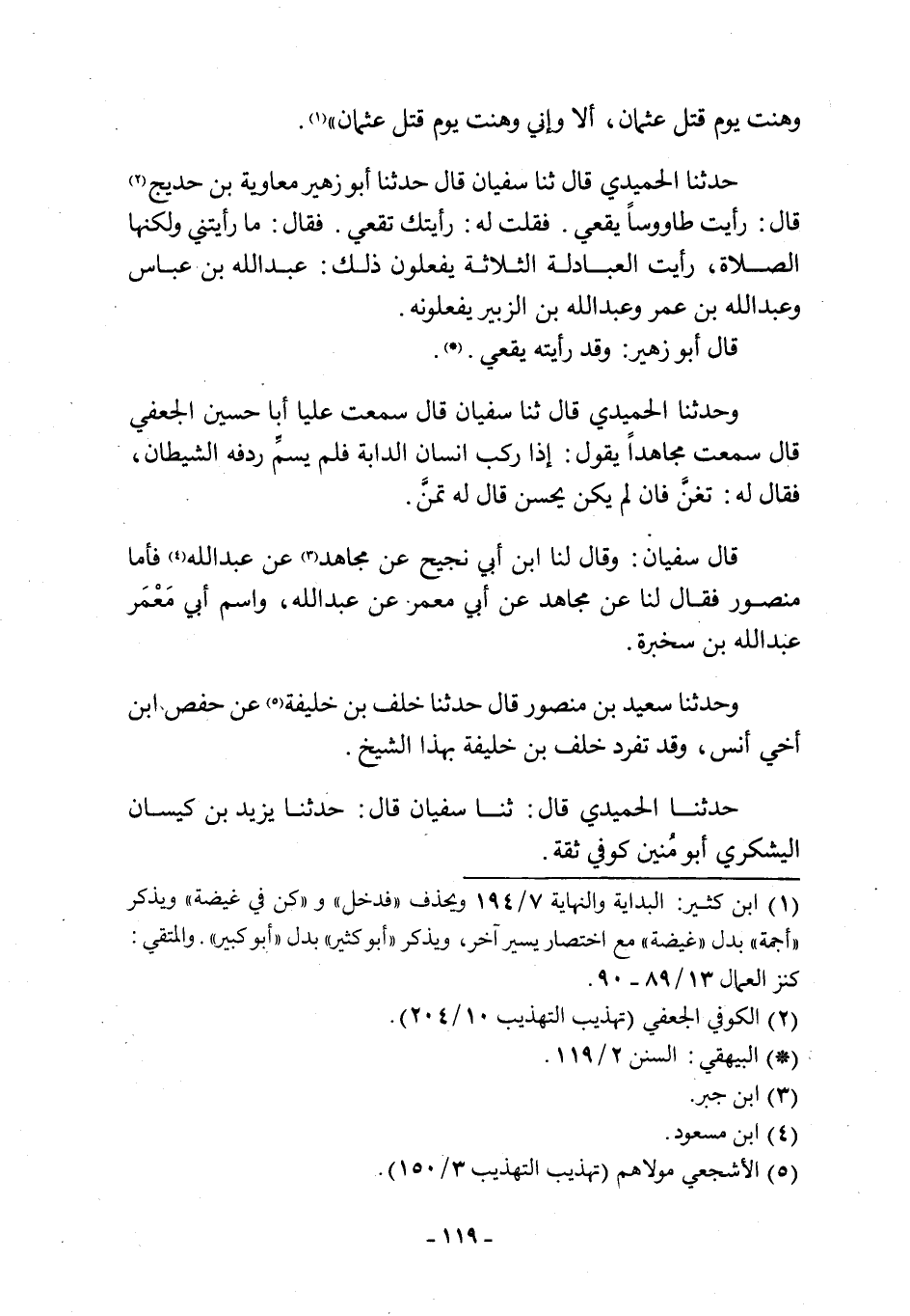 وَإِنِّي وَهَنْتُ يَوْمَ قُتِلَ عُثْمَانُ، أَلَا وَإِنِّي وَهَنْتُ يَوْمَ قُتِلَ عُثْمَانُ» [1] . حَدَّثَنَا الْحُمَيْدِيُّ قَالَ ثنا سُفْيَانُ قَالَ حَدَّثَنَا أَبُو زُهَيْرٍ مُعَاوِيَةُ بن حديج [2] قال: رأيت طاووسا يُقْعِي. فَقُلْتُ لَهُ: رَأَيْتُكَ تُقْعِي. فَقَالَ: