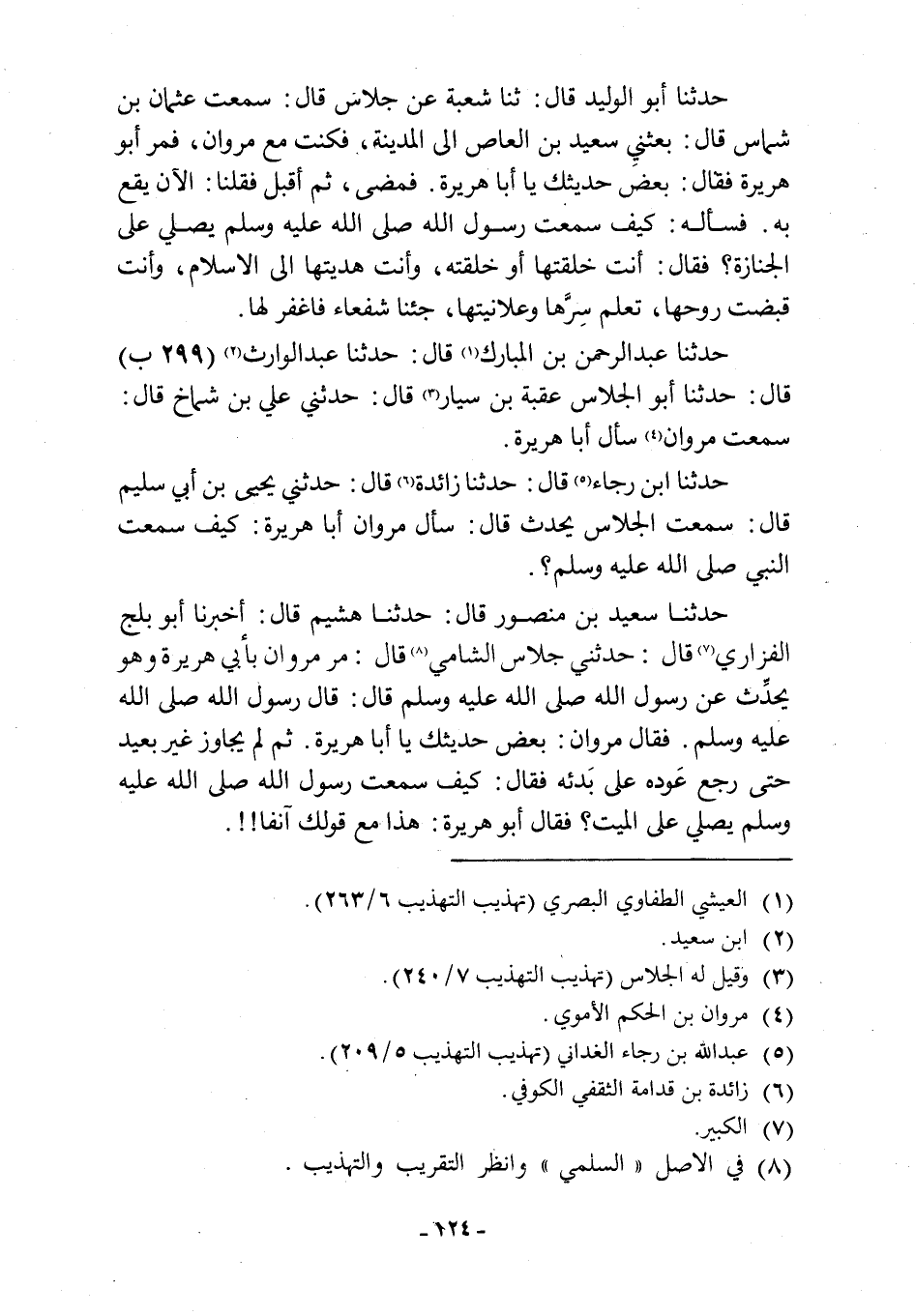 حَدَّثَنَا سَعِيدُ بْنُ مَنْصُورٍ قَالَ: حَدَّثَنَا هُشَيْمٌ قَالَ: أَخْبَرَنَا أَبُو بَلْجٍ الْفَزَارِيُّ [7] قَالَ: حَدَّثَنِي جُلَّاسٌ الشَّامِيُّ قَالَ: مَرَّ مَرْوَانُ بِأَبِي هُرَيْرَةَ وَهُوَ يُحَدِّثُ عَنْ رسول الله صلى الله عليه وسلم قال: قَالَ رَسُولُ اللَّهِ صَلَّى اللَّهُ عَلَيْهِ وَسَلَّمَ. فَقَالَ مَرْوَانُ: بَعْضُ حَدِيثِكَ يَا أَبَا هُرَيْرَةَ. ثُمَّ لَمْ يُجَاوِزْ غَيْرَ بَعِيدٍ حَتَّى رَجَعَ عَوْدُهُ عَلَى بَدْئِهِ فَقَالَ: كَيْفَ سَمِعْتَ رَسُولَ اللَّهِ صَلَّى اللَّهُ عَلَيْهِ وَسَلَّمَ يُصَلِّي عَلَى الْمَيِّتِ؟ فَقَالَ أَبُو هُرَيْرَةَ: هَذَا مَعَ قَوْلِكَ آنفا!!