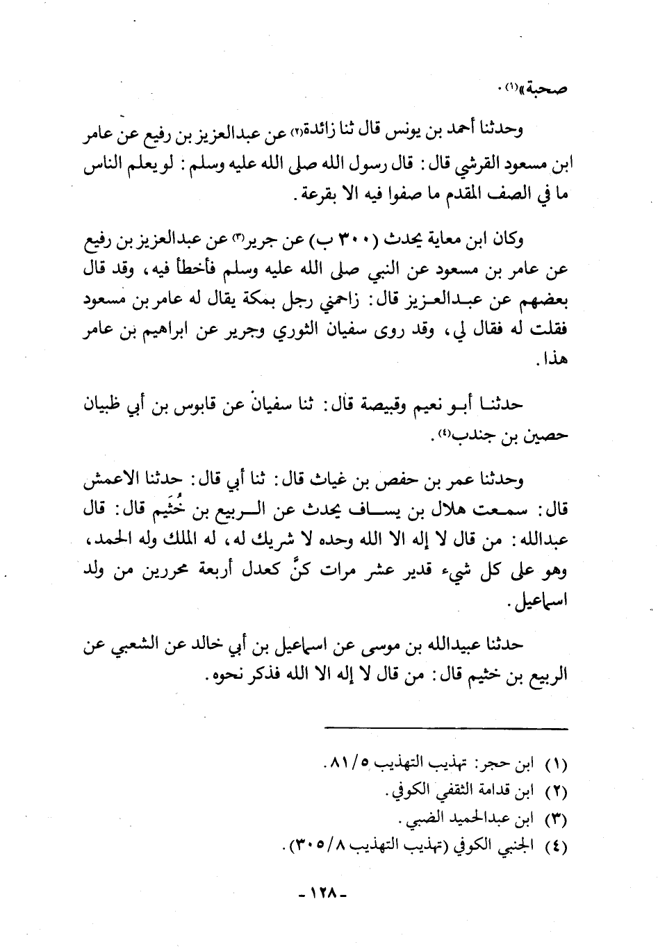 وَحَدَّثَنَا عُمَرُ بْنُ حَفْصِ بْنِ غِيَاثٍ قَالَ: ثنا أَبِي قَالَ: حَدَّثَنَا الْأَعْمَشُ قَالَ: سَمِعْتُ هِلَالَ بْنَ يَسَافٍ يُحَدِّثُ عن الربيع بن خشيم قَالَ: قَالَ عَبْدُ اللَّهِ: مَنْ قَالَ لَا إِلَهَ إِلَّا اللَّهُ وَحْدَهُ لَا شَرِيكَ لَهُ، لَهُ الْمُلْكُ وَلَهُ الْحَمْدُ، وَهُوَ عَلَى كُلِّ شَيْءٍ قَدِيرٌ عَشْرَ مَرَّاتٍ كُنَّ كَعَدْلِ أَرْبَعَةٍ محررين من ولد إسماعيل.
