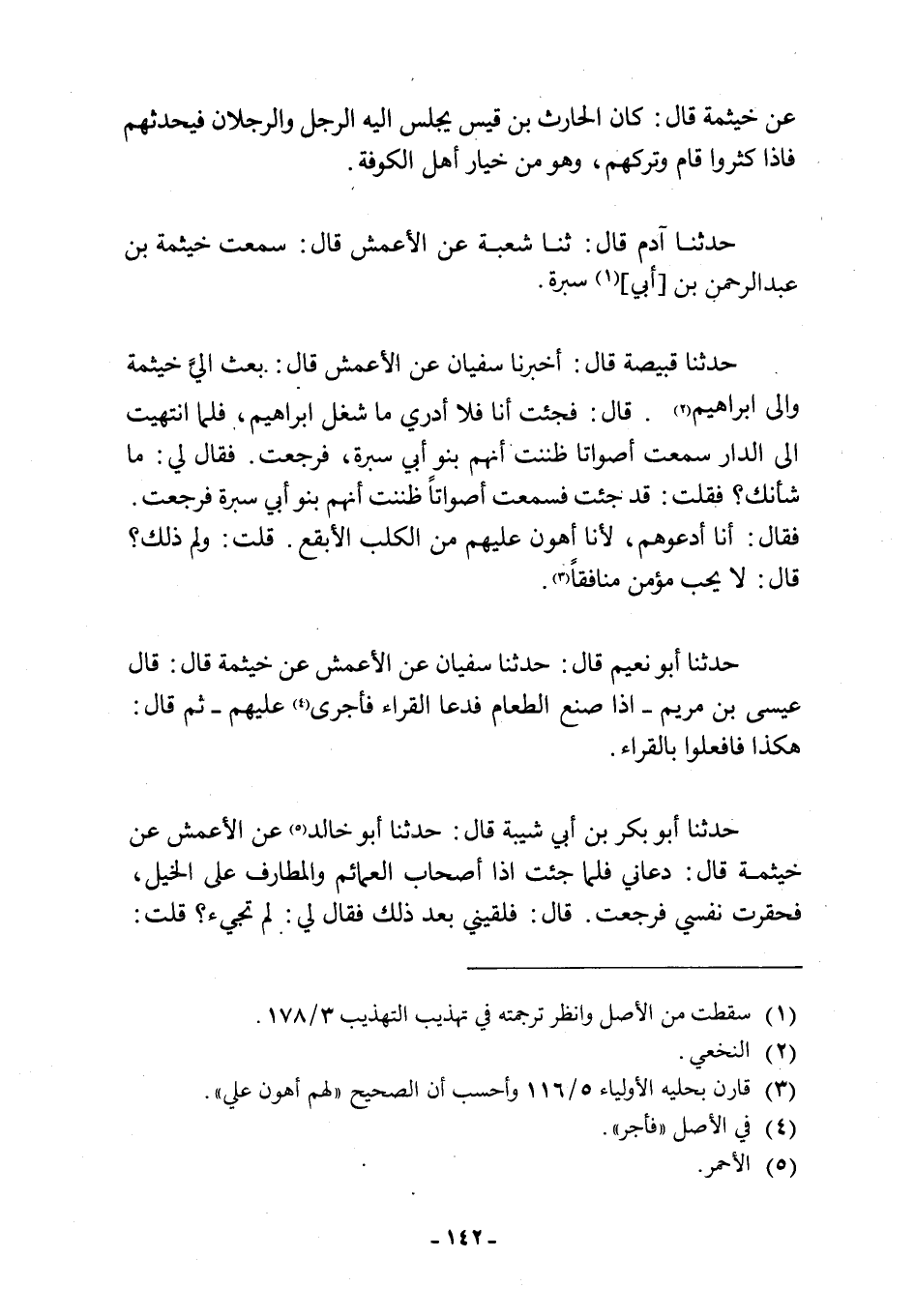 حَدَّثَنَا أبو بكر بن أبي شيبة قال: حدثنا أَبُو خَالِدٍ [5] عَنِ الْأَعْمَشِ عَنْ خَيْثَمَةَ قَالَ: دَعَانِي فَلَمَّا جِئْتُ إِذَا أَصْحَابُ الْعَمَائِمِ وَالْمَطَارِفِ عَلَى الْخَيْلِ، فَحَقَرْتُ نَفْسِي فَرَجَعْتُ. قَالَ: فَلَقِينَيِ بعد ذلك فقال لي: لم تجيء؟