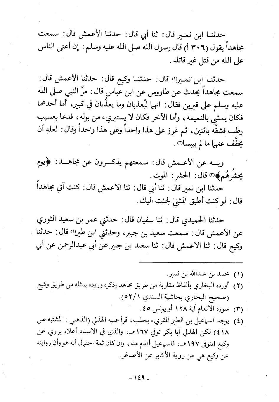 سَمِعْتُ مُجَاهِدًا يحدث عن طاووس عَنِ ابْنِ عَبَّاسٍ قَالَ: مَرَّ النَّبِيُّ صَلَّى اللَّهُ عَلَيْهِ وَسَلَّمَ عَلَى قَبْرَيْنِ فَقَالَ: إِنَّهُمَا لَيُعَذَّبَانِ وَمَا يُعَذَّبَانِ فِي كَبِيرٍ، أَمَّا أَحَدُهُمَا فَكَانَ يَمْشِي بِالنَّمِيمَةِ، وَأَمَّا الْآخَرُ فَكَانَ لَا يَسْتَبْرِئُ مِنْ بَوْلِهِ، فَدَعَا بِعَسِيبٍ رَطْبٍ فَشَقَّهُ بِاثْنَيْنِ، ثُمَّ غَرَزَ عَلَى هَذَا وَاحِدًا وَعَلَى هَذَا وَاحِدًا وَقَالَ: لَعَلَّهُ أَنْ يُخَفَّفَ عَنْهُمَا مَا لَمْ يَيْبَسَا [2] . وَبِهِ عَنِ الْأَعْمَشِ قَالَ: سمعتهم يذكرون عن مجاهد: يَوْمَ يَحْشُرُهُمْ 6: 128 [3] قَالَ: الْحَشْرُ: الْمَوْتُ.