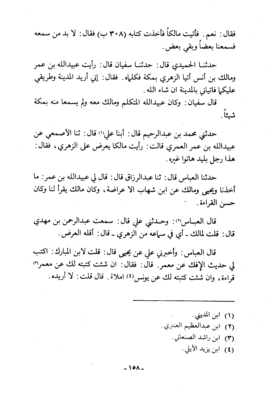 قَالَ الْعَبَّاسُ [2] : وَحَدَّثَنِي عَلِيٌّ قَالَ: سَمِعْتُ عَبْدَ الرَّحْمَنِ بْنَ مَهْدِيٍّ قَالَ: قُلْتُ لِمَالِكٍ- أَيْ فِي سَمَاعِهِ مِنَ الزُّهْرِيِّ- قَالَ: أَقَلَّهُ الْعَرْضُ.