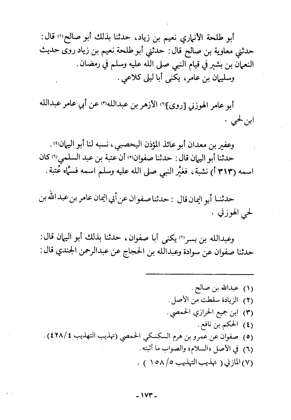 حَدَّثَنَا أَبُو الْيَمَانِ قَالَ: حَدَّثَنَا صَفْوَانُ [5] أَنَّ عُتْبَةَ بن عبد السلمي [6] كان اسمه (313 أ) نَشْبَةَ، فَغَيَّرَ النَّبِيُّ صَلَّى اللَّهُ عَلَيْهِ وَسَلَّمَ اسْمَهُ فَسَمَّاهُ عُتْبَةَ.