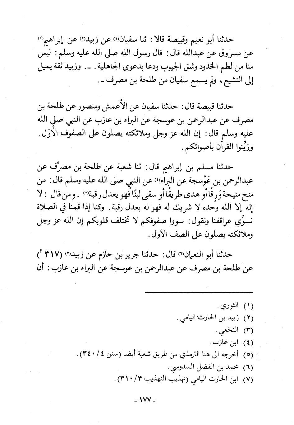 وَكُنَّا إِذَا قمنا في الصلاة نسوّي عراقفنا وَنَقُولُ: سَوُّوا صُفُوفَكُمْ لَا تَخْتَلِفُ قُلُوبُكُمْ إِنَّ اللَّهَ عَزَّ وَجَلَّ وَمَلَائِكَتَهُ يُصَلُّونَ عَلَى الصَّفِّ الْأَوَّلِ. حَدَّثَنَا أَبُو النُّعْمَانِ [6] قَالَ: حَدَّثَنَا جَرِيرُ بن حازم عن زبيد [7] (317 أ) عَنْ طَلْحَةَ بْنِ مُصَرِّفٍ عَنْ عَبْدِ الرَّحْمَنِ بن عوسجة عن البراء بن