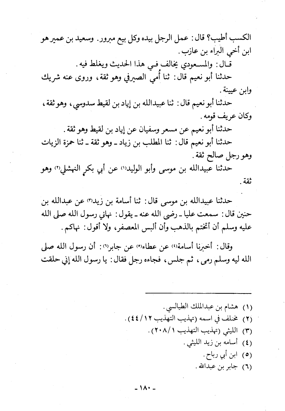 حَدَّثَنَا عُبَيْدُ اللَّهِ بْنُ مُوسَى قَالَ: ثنا أُسَامَةُ بْنُ زَيْدٍ [3] عَنْ عَبْدِ اللَّهِ بْنِ حُنَيْنٍ قَالَ: سَمِعْتُ عَلِيًّا- رَضِيَ اللَّهُ عَنْهُ- يَقُولُ: نَهَانِي رَسُولُ اللَّهِ صَلَّى اللَّهُ عَلَيْهِ وَسَلَّمَ أَنْ أَتَخَتَّمَ بِالذَّهَبِ وَأَنْ أَلْبَسَ الْمُعَصْفَرَ، وَلَا أَقُولُ: نَهَاكُمْ. وَقَالَ: أَخْبَرَنَا أُسَامَةُ [4] عَنْ عَطَاءٍ [5] عَنْ جَابِرٍ [6] : أَنّ رَسُولَ اللَّهِ صَلَّى اللَّهُ عَلَيْهِ وَسَلَّمَ رَمَى، ثُمَّ جَلَسَ، فجاءه رجل فقال: يا رسول الله