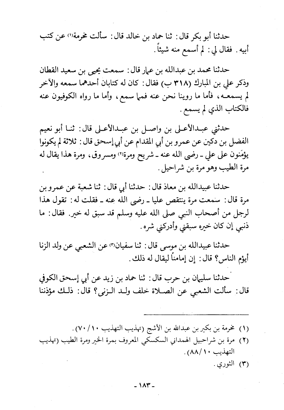 حَدَّثَنِي عَبْدُ الْأَعْلَى بْنُ وَاصِلِ بْنِ عَبْدِ الْأَعْلَى قَالَ: ثنا أَبُو نُعَيْمٍ الْفَضْلُ بْنُ دُكَيْنٍ عَنْ عَمْرِو بْنِ أَبِي الْمِقْدَامِ عَنْ أَبِي إِسْحَاقَ قَالَ: ثَلَاثَةٌ لَمْ يَكُونُوا يُؤَمِّنُونَ عَلَى عَلِيٍّ- رَضِيَ اللَّهُ عَنْهُ- شُرَيْحٌ وَمُرَّةُ [2] وَمَسْرُوقٌ، وَمُرَّةُ هَذَا يُقَالُ لَهُ مُرَّةُ الطَّيِّبُ وَهُوَ مُرَّةُ بْنُ شَرَاحِيلَ.
