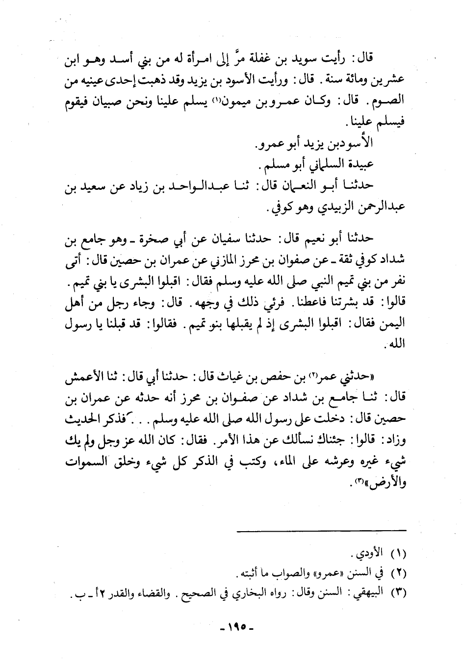 فَقَالُوا: قَدْ قَبِلْنَا يَا رَسُولَ اللَّهِ. حَدَّثَنِي عُمَرُ [2] بْنُ حَفْصِ بْنِ غِيَاثٍ قَالَ: حَدَّثَنَا أَبِي قَالَ: ثنا الْأَعْمَشُ قَالَ: ثنا جَامِعُ بْنُ شَدَّادٍ عَنْ صَفْوَانَ بْنِ مُحْرِزٍ أَنَّهُ حَدَّثَهُ عَنْ عِمْرَانَ بْنِ حُصَيْنٍ قَالَ: دَخَلْتُ عَلَى رَسُولِ اللَّهِ صَلَّى اللَّهُ عَلَيْهِ وَسَلَّمَ ... فَذَكَرَ الْحَدِيثَ وَزَادَ: قَالُوا: جِئْنَاكَ نَسْأَلُكَ عَنْ هَذَا الْأَمْرِ. فَقَالَ: كَانَ اللَّهُ عزَّ وَجَلَّ وَلَمْ يَكُ شَيْءٌ غَيْرُهُ وَعَرْشُهُ عَلَى الْمَاءِ، وَكَتَبَ فِي الذِّكْرِ كُلَّ شيء وخلق السموات والأرض.