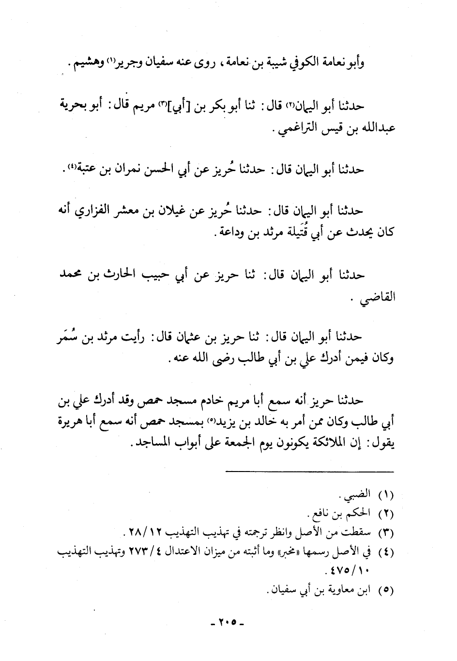 حَدَّثَنَا حُرَيْزٌ أَنَّهُ سَمِعَ أَبَا مَرْيَمَ خَادِمَ مَسْجِدِ حِمْصٍ وَقَدْ أَدْرَكَ عَلِيَّ بْنَ أَبِي طَالِبٍ وَكَانَ مِمَّنْ أَمَرَ بِهِ خَالِدُ بْنُ يَزِيدَ [5] بِمَسْجِدِ حِمْصٍ أَنَّهُ سَمِعَ أَبَا هُرَيْرَةَ يَقُولُ: إِنَّ الْمَلَائِكَةَ يكونون يوم الجمعة على أبواب