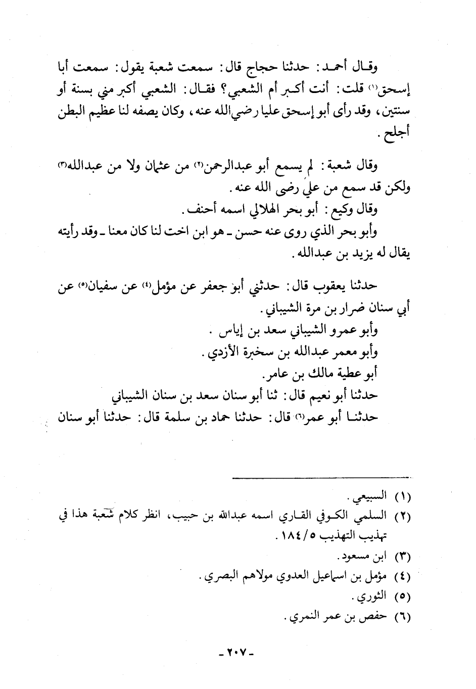 وَقَالَ أَحْمَدُ: حَدَّثَنَا حَجَّاجٌ قَالَ: سَمِعْتُ شُعْبَةَ يَقُولُ: سَمِعْتُ أَبَا إِسْحَاقَ [1] قُلْتُ: أَنْتَ أَكْبَرُ أَمِ الشَّعْبِيُّ؟ فَقَالَ: الشَّعْبِيُّ أَكْبَرُ مِنِّي بِسَنَةٍ أَوْ سَنَتَيْنِ، وَقَدْ رَأَى أَبُو إِسْحَاقَ عَلِيًّا رَضِيَ اللَّهُ عَنْهُ، وَكَانَ يَصِفُهُ لَنَا عَظِيمَ الْبَطْنِ أَجْلَحَ.