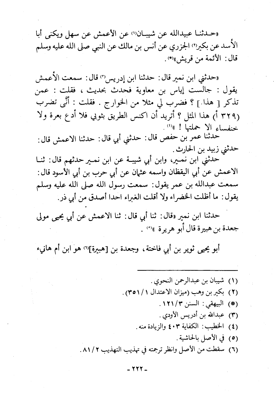 حَدَّثَنَا عُبَيْدُ اللَّهِ عَنْ شَيْبَانَ [1] عَنِ الْأَعْمَشِ عَنْ سَهْلٍ وَيُكَنَّى أَبَا الأَسَدِ عَنْ بُكَيْرٍ [2] الْجَزَرِيِّ عَنْ أَنَسِ بْنِ مَالِكٍ عَنِ النَّبِيِّ صَلَّى اللَّهُ عَلَيْهِ وَسَلَّمَ قَالَ: الْأَئِمَّةُ مِنْ قُرَيْشٍ. «حَدَّثَنِي ابْنُ نُمَيْرٍ قَالَ: حَدَّثَنَا ابْنُ إِدْرِيسَ [3] قَالَ: سَمِعْتُ الْأَعْمَشَ يَقُولُ: جَالَسْتُ إِيَاسَ بْنَ مُعَاوِيَةَ بِحَدِيثٍ، فَقُلْتُ: عَمَّنْ تَذْكُرُ [هَذَا] ؟