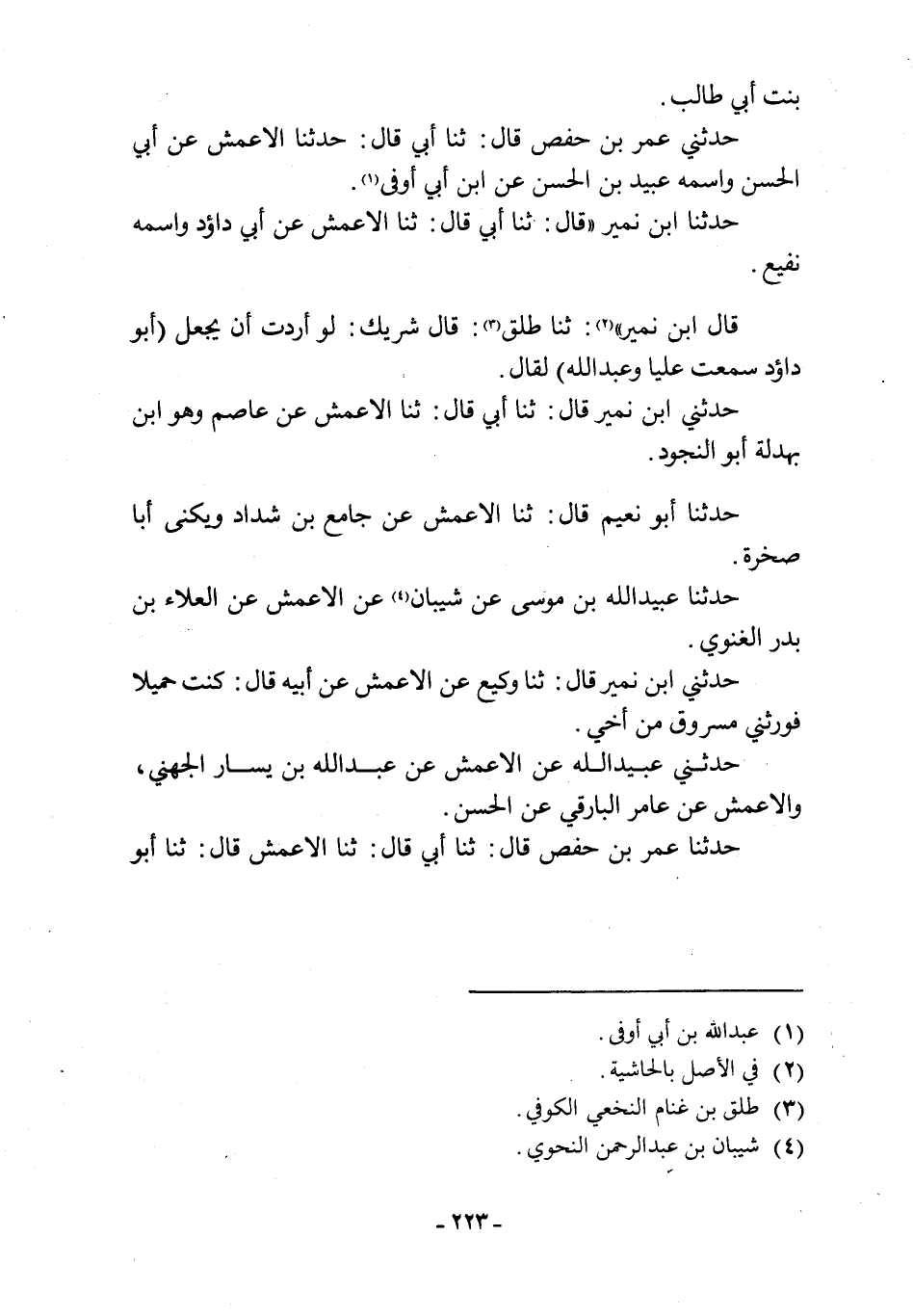 حَدَّثَنَا عُبَيْدُ اللَّهِ بْنُ مُوسَى عَنْ شَيْبَانَ [4] عَنِ الْأَعْمَشِ عَنِ الْعَلَاءِ بْنِ بَدْرٍ الْغَنَوِيِّ.