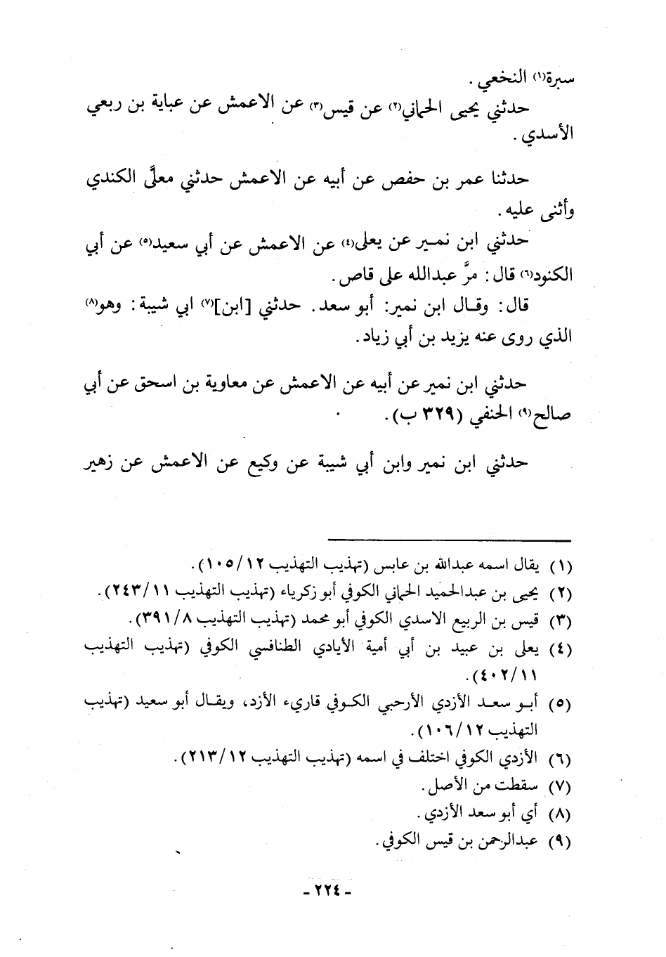 حَدَّثَنِي يَحْيَى الْحُمَّانِيُّ [2] عَنْ قَيْسٍ [3] عَنِ الْأَعْمَشِ عَنْ عَبَايَةَ بْنِ رِبْعِيٍّ الْأَسَدِيِّ.