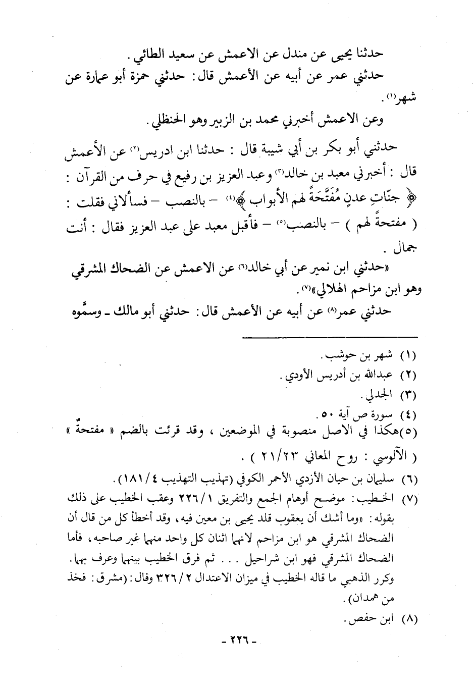 حدثني أبو بكر بن أبي شيبة قَالَ: حَدَّثَنَا ابْنُ إِدْرِيسَ [2] عَنِ الْأَعْمَشِ قَالَ: أَخْبَرَنِي مَعْبَدُ بْنُ خَالِدٍ [3] وَعَبْدُ الْعَزِيزِ بْنُ رَفِيعٍ فِي حَرْفٍ مِنَ الْقِرَاءَاتِ: جَنَّاتِ عَدْنٍ مُفَتَّحَةً لَهُمُ الْأَبْوابُ 38: 50 [4]- بالنصب- فسألاني فقلت: (مفتحة لهم) - بِالنَّصْبِ- فَأَقْبَلَ مَعْبَدُ عَلَى عَبْدِ الْعَزِيزِ فَقَالَ: أَنْتَ حَمَّالٌ [5] .
