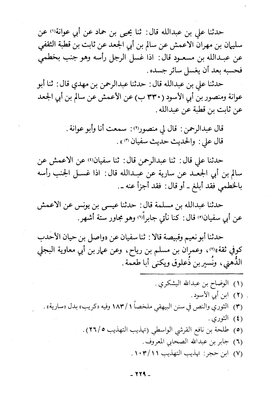 حَدَّثَنَا عَلِيٌّ قَالَ: ثنا عَبْدُ الرَّحْمَنِ قَالَ: ثنا سُفْيَانُ [4] عَنِ الْأَعْمَشِ عَنْ سَالِمِ بْنِ أَبِي الْجَعْدِ عَنْ سَارِيَةَ عَنْ عَبْدِ اللَّهِ قَالَ: إِذَا غَسَلَ الْجُنُبُ رَأْسَهُ بِالْخِطْمِيِّ فَقَدْ أَبْلَغَ- أَوْ قَالَ: فَقَدْ أَجْزَأَ عَنْهُ-.