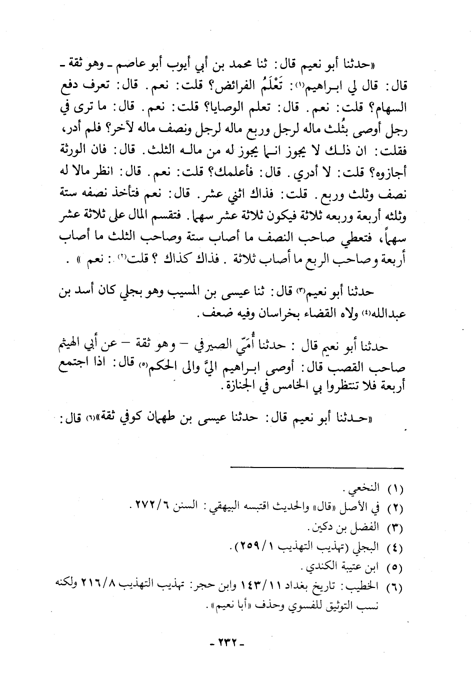 حَدَّثَنَا أَبُو نُعَيْمٍ قَالَ: ثنا مُحَمَّدُ بْنُ أَبِي أيُّوبَ أَبُو عَاصِمٍ- وَهُوَ ثِقَةٌ- قَالَ: قَالَ لِي إِبْرَاهِيمُ [1] : تَعْلَمُ الْفَرَائِضَ؟ قُلْتُ: نَعَمْ. قَالَ: تَعْرِفُ دَفْعَ السِّهَامِ؟ قُلْتُ: نَعَمْ. قَالَ: تَعْلَمُ الْوَصَايَا؟ قُلْتُ: نَعَمْ. قَالَ: مَا تَرَى فِي رَجُلٍ أَوْصَى بِثُلُثِ مَالِهِ لِرَجُلٍ وَرُبُعِ ماله لرجل ونصف ماله لآخر؟