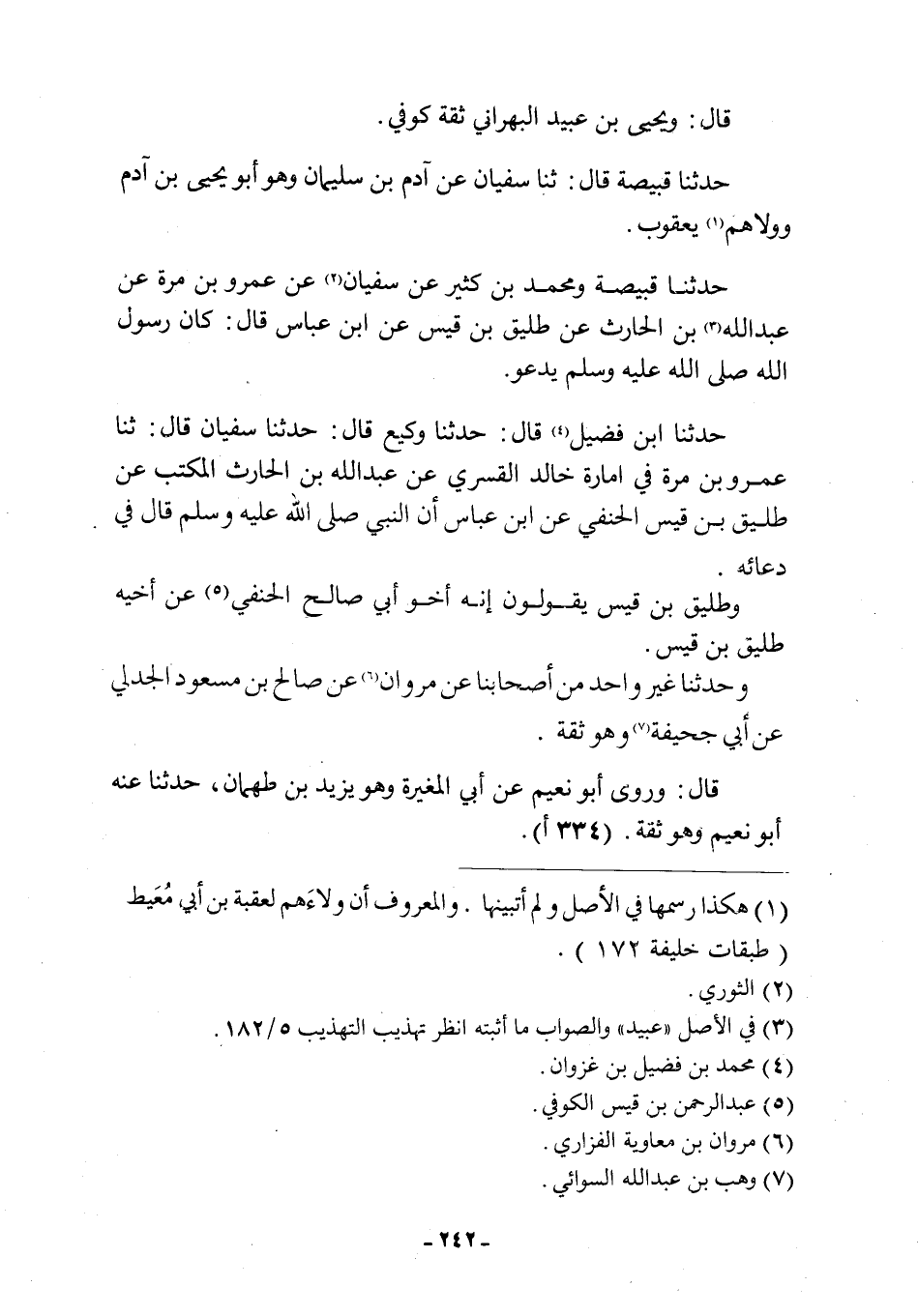 حَدَّثَنَا ابْنُ فُضَيْلٍ [4] قَالَ: حَدَّثَنَا وَكِيعٌ قَالَ: حَدَّثَنَا سُفْيَانُ قَالَ: ثنا عَمْرُو بْنُ مُرَّةَ فِي إِمَارَةِ خَالِدٍ الْقَسْرِيِّ عَنْ عَبْدِ اللَّهِ بْنِ الْحَارِثِ الْمُكْتَبِ عَنْ طَلِيقِ بْنِ قَيْسٍ الْحَنَفِيِّ عَنِ ابْنِ عَبَّاسٍ وَعَنِ النَّبِيِّ صَلَّى اللَّهُ عَلَيْهِ وَسَلَّمَ قَالَ فِي دُعَائِهِ.