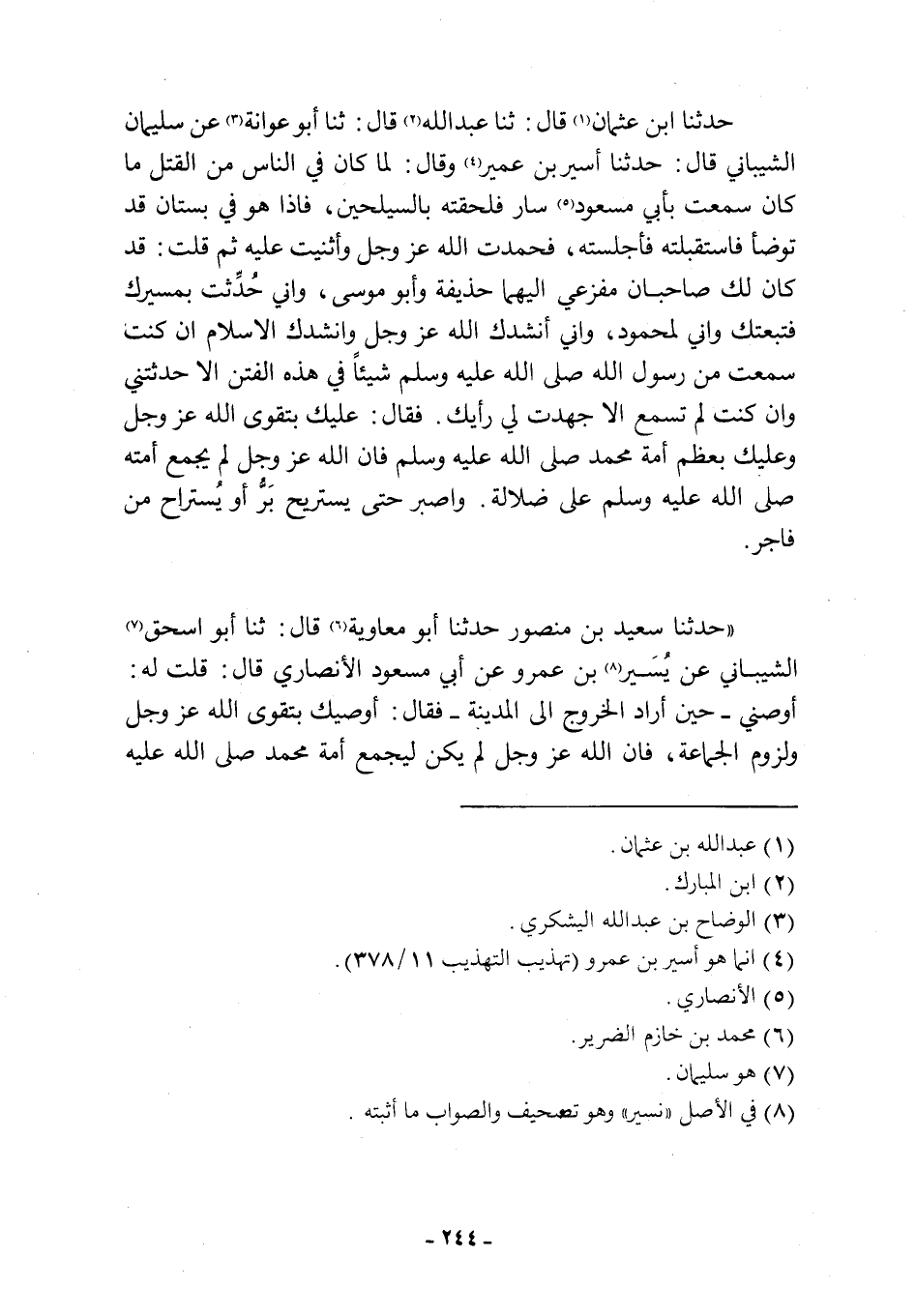 حدثنا ابن عثمان [1] قال: ثنا عبد الله [2] قَالَ: ثنا أَبُو عَوَانَةَ [3] عَنْ سُلَيْمَانَ الشَّيْبَانِيِّ قَالَ: حَدَّثَنَا أَسِيرُ بْنُ عُمَيْرٍ [4] وَقَالَ: لَمَّا كَانَ فِي النَّاسِ مِنَ الْقَتْلِ مَا كَانَ سَمِعْتُ بِأَبِي مَسْعُودٍ [5] سَارَ فَلَحِقْتُهُ بِالسَّيْلَحِينَ، فَإِذَا هُوَ فِي بُسْتَانٍ قَدْ تَوَضَّأَ فَاسْتَقْبَلْتُهُ فَأَجْلَسْتُهُ، فحمد اللَّهَ عَزَّ وَجَلَّ وَأَثْنَيْتُ عَلَيْهِ ثُمَّ قُلْتُ: قَدْ كَانَ لَكَ صَاحِبَانِ مَفْزَعِي إِلَيْهِمَا حُذَيْفَةُ وَأَبُو مُوسَى، وَإِنِّي حُدِّثْتُ بِمَسِيرِكَ فَتَبِعْتُكَ وَإِنِّي لَمَحْمُودٌ، وَإِنِّي أُنْشِدُكَ اللَّهَ عَزَّ وَجَلَّ وَأُنْشِدُكَ الْإِسْلَامَ إِنْ كُنْتَ سَمِعْتَ مِنْ رَسُولِ اللَّهِ صَلَّى اللَّهُ عَلَيْهِ وَسَلَّمَ شَيْئًا فِي هَذِهِ الْفِتَنِ إِلَّا حَدَّثْتَنِي وَإِنْ كُنْتَ لَمْ تَسْمَعْ إِلَّا جَهَدْتَ لِي رَأْيَكَ. فَقَالَ: عَلَيْكَ بِتَقْوَى اللَّهِ عَزَّ وَجَلَّ وَعَلَيْكَ بِعُظْمِ أُمَّةِ مُحَمَّدٍ صَلَّى اللَّهُ عَلَيْهِ وَسَلَّمَ، فَإِنَّ اللَّهَ عَزَّ وَجَلَّ لَمْ يَجْمَعْ أُمَّتَهُ صَلَّى اللَّهُ عَلَيْهِ وسلم على ضلالة. واصبر حتى يستريح بر أَوْ يُسْتَرَاحَ مِنْ فَاجِرٍ.