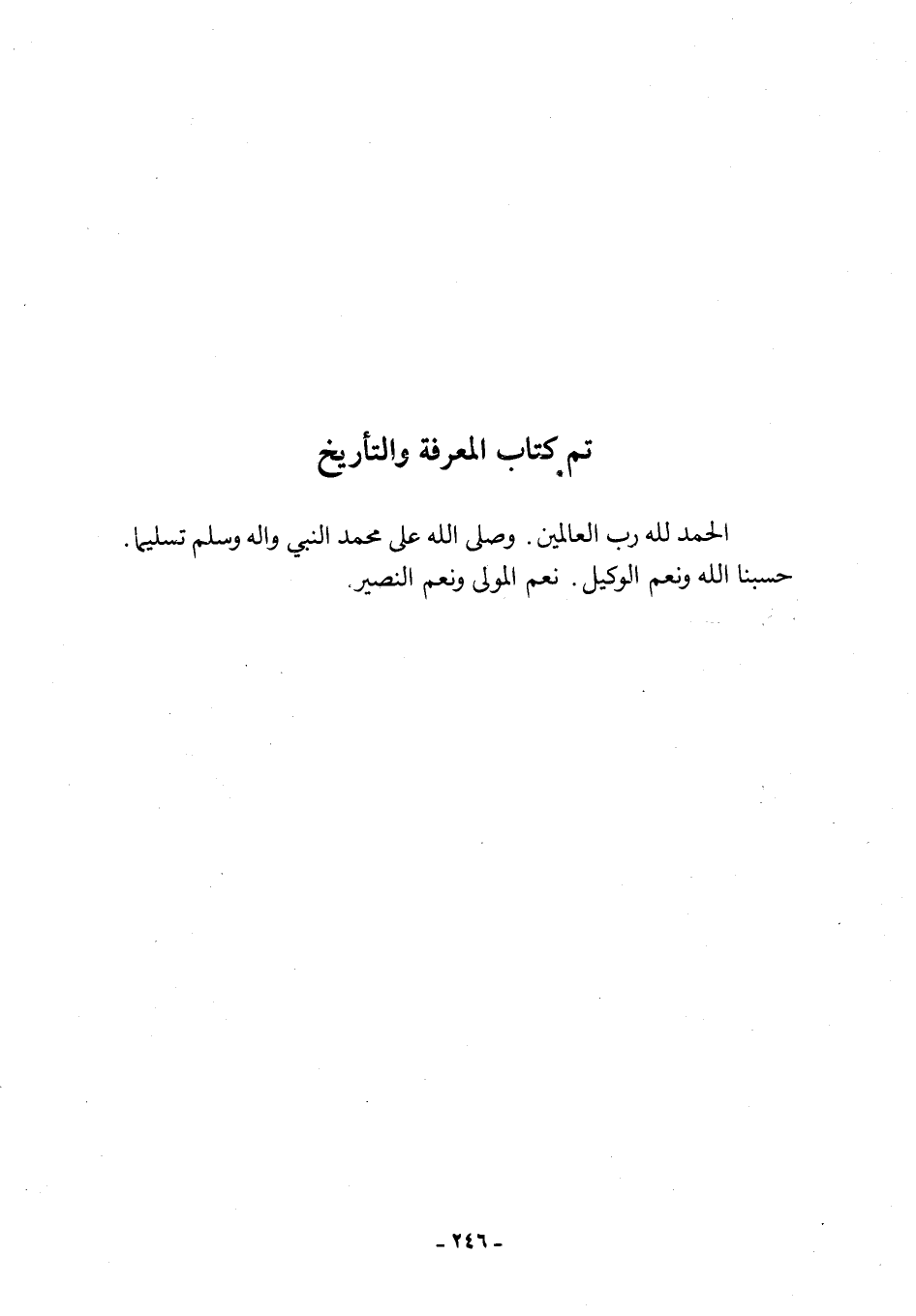 تم كتاب المعرفة والتأريخ الحمد للَّه رب العالمين. وصلى الله على محمد النبي وآله وسلم تسليما. حسبنا الله ونعم الوكيل. نعم المولى ونعم النصير.