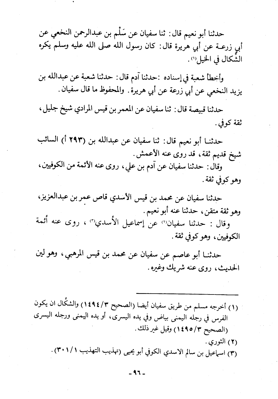 حدثنا أبو نعيم قال: ثنا سفيان عن سَلْمِ بْنِ عَبْدِ الرَّحْمَنِ النَّخَعِيِّ عَنْ أَبِي زُرْعَةَ عَنْ أَبِي هُرَيْرَةَ قَالَ: كَانَ رَسُولُ اللَّهِ صَلَّى اللَّهُ عَلَيْهِ وَسَلَّمَ يَكْرَهُ الشَّكَالَ فِي الْخَيْلِ [1] . وَأَخْطَأَ شُعْبَةُ فِي إِسْنَادِهِ: حَدَّثَنَا آدَمُ قَالَ: حَدَّثَنَا شُعْبَةُ عَنْ عَبْدِ اللَّهِ بْنِ يَزِيدَ النَّخَعِيِّ عَنْ أَبِي زُرْعَةَ عَنْ أَبِي هُرَيْرَةَ. وَالْمَحْفُوظُ مَا قَالَ سُفْيَانُ.