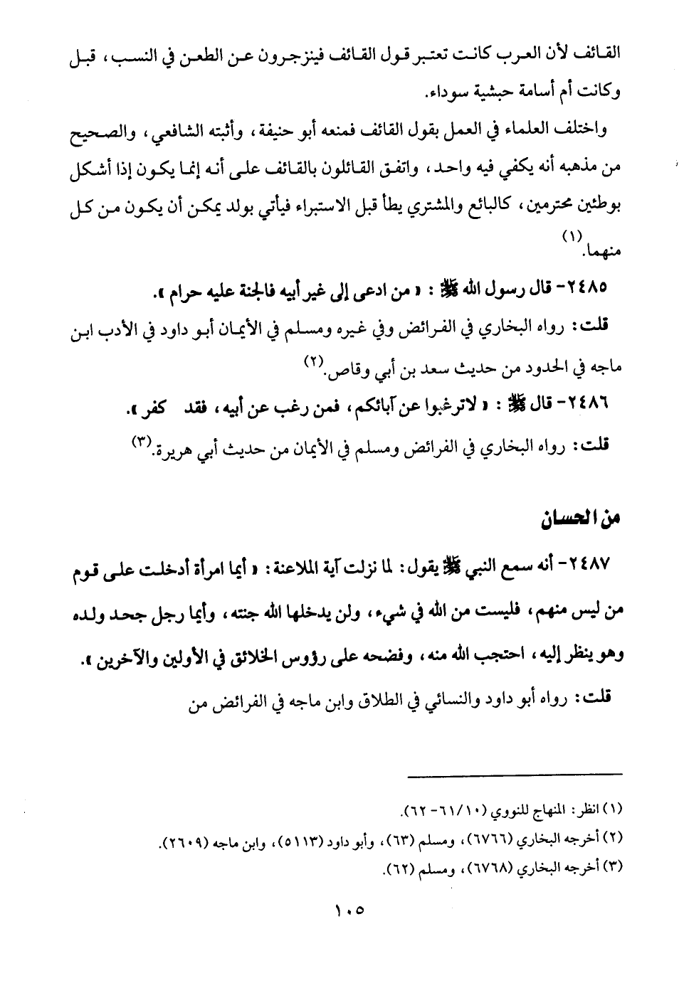 2485 - قال رسول الله -صلى الله عليه وسلم-: "من ادعى إلى غير أبيه فالجنة عليه حرام".