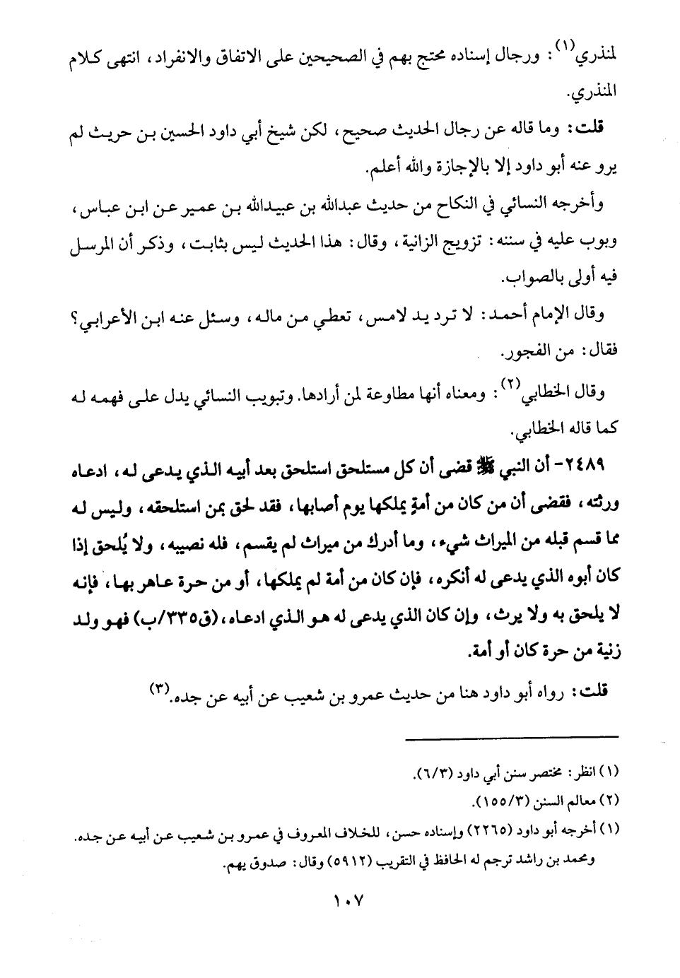 2489 - أن النبي - صلى الله عليه وسلم - قضى أن كل مستلحق استلحق بعد أبيه الذي يدعى له، ادعاه ورثته، فقضى أن من كان من أمةٍ يملكها يوم أصابها، فقد لحق بمن استلحقه، وليس له مما قسم قبله من الميراث شيء، وما أدرك من ميراث لم يقسم، فله نصيبه، ولا يُلحق إذا كان أبوه الذي يدعي له أنكره، فإن كان من أمة لم يملكها، أو من حرة عاهر بها، فإنه لا يلحق به ولا يرث، وإن كان الذي يدعي له هو الذي ادعاه، فهو ولد زنية من حرة كان أو أمة.