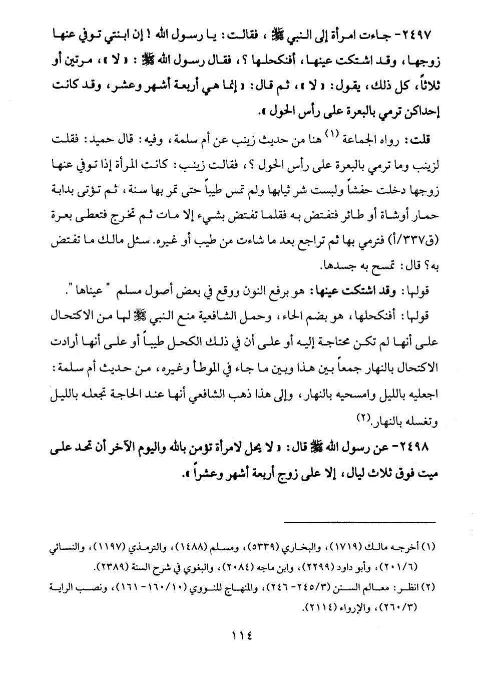 2497 - جاءت امرأة إلى النبي - صلى الله عليه وسلم -، فقالت: يا رسول الله! إن ابنتي توفي عنها زوجها، وقد اشتكت عينها، أفنكحلها؟، فقال رسول الله - صلى الله عليه وسلم -: "لا"، مرتين أو ثلاثًا، كل ذلك، يقول: "لا"، ثم قال: "إنما هي أربعة أشهر وعشر، وقد كانت إحداكن ترمي بالبعرة على رأس الحول".