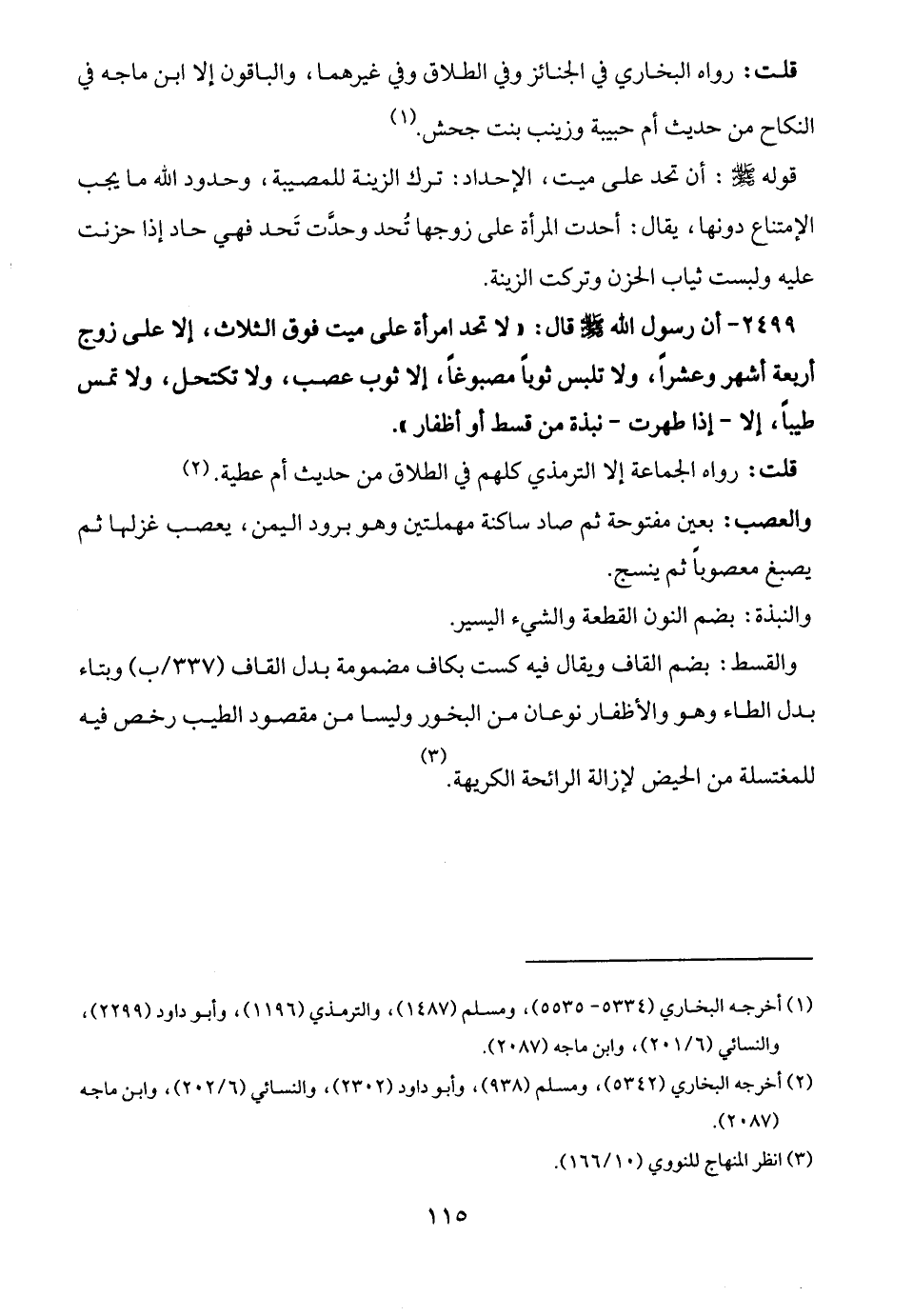 2499 - أن رسول الله - صلى الله عليه وسلم - قال: "لا تحد امرأة على ميت فوق الثلاث، إلا على زوج أربعة أشهر وعشرًا، ولا تلبس ثوبًا مصبوغًا، إلا ثوب عصب، ولا تكتحل، ولا تمس طيبًا، إلا -إذا طهرت- نبذة من قسط أو أظفار".