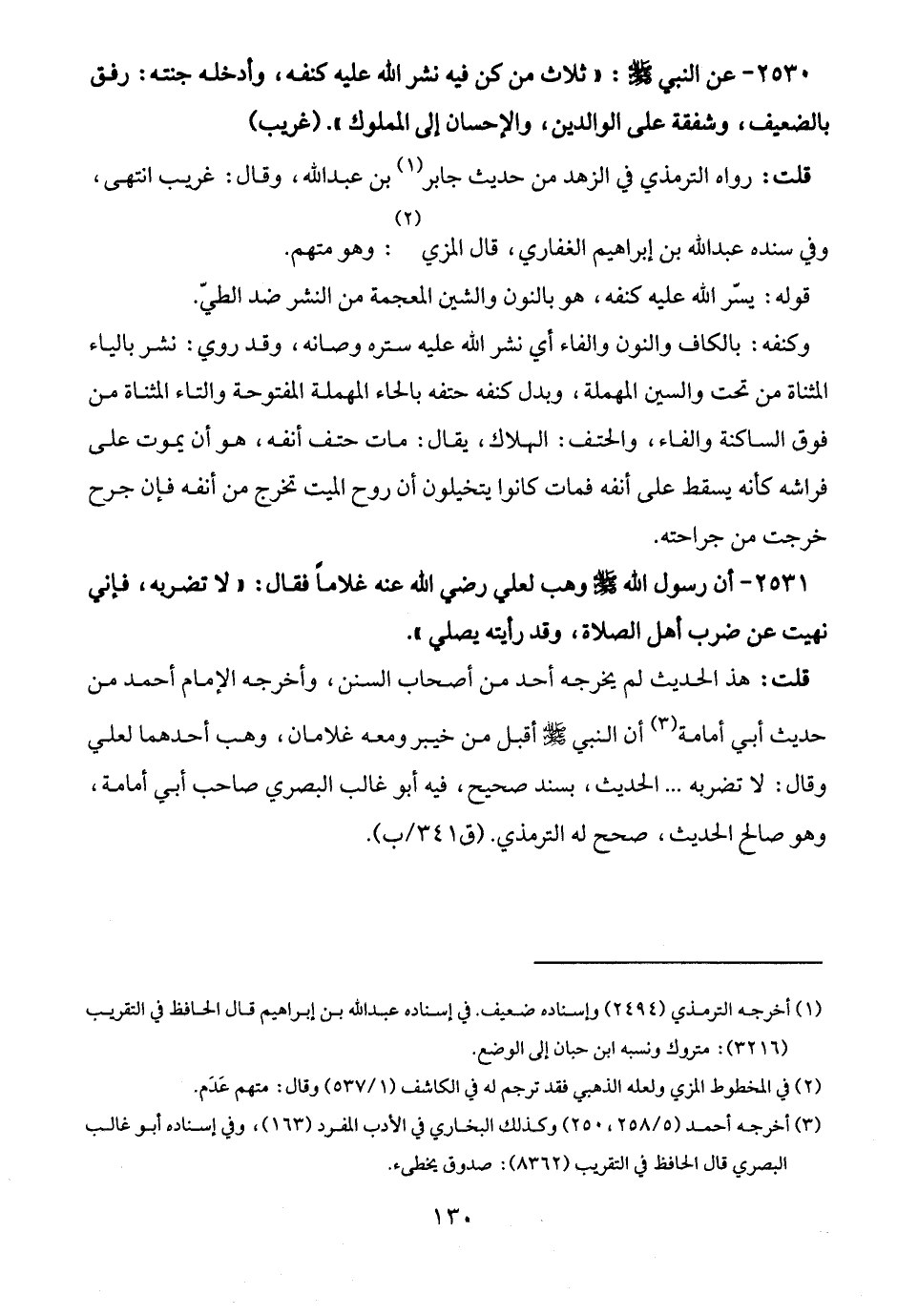 2530 - عن النبي - صلى الله عليه وسلم -: "ثلاث من كن فيه نشر الله عليه كنفه، وأدخله جنته: رفق بالضعيف، وشفقة على الوالدين، والإحسان إلى المملوك". (غريب)