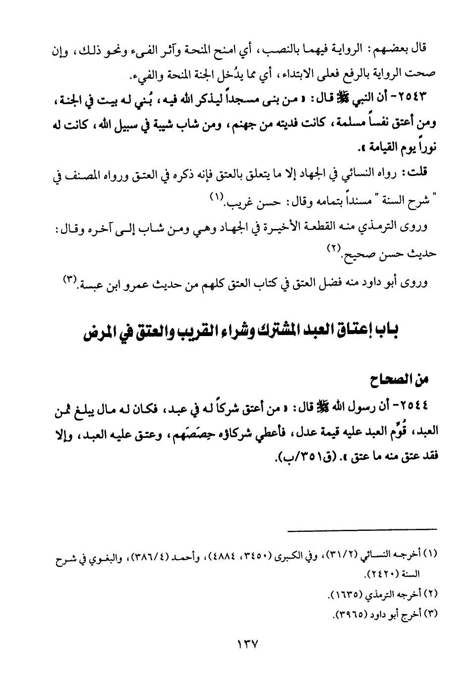 2544 - أن رسول الله - صلى الله عليه وسلم - قال: "من أعتق شركًا له في عبد، فكان له مال يبلغ ثمن العبد، قُوِّم العبد عليه قيمة عدل، فأعطي شركاؤه حِصَصَهم، وعتق عليه العبد، وإلا فقد عتق منه ما عتق".
