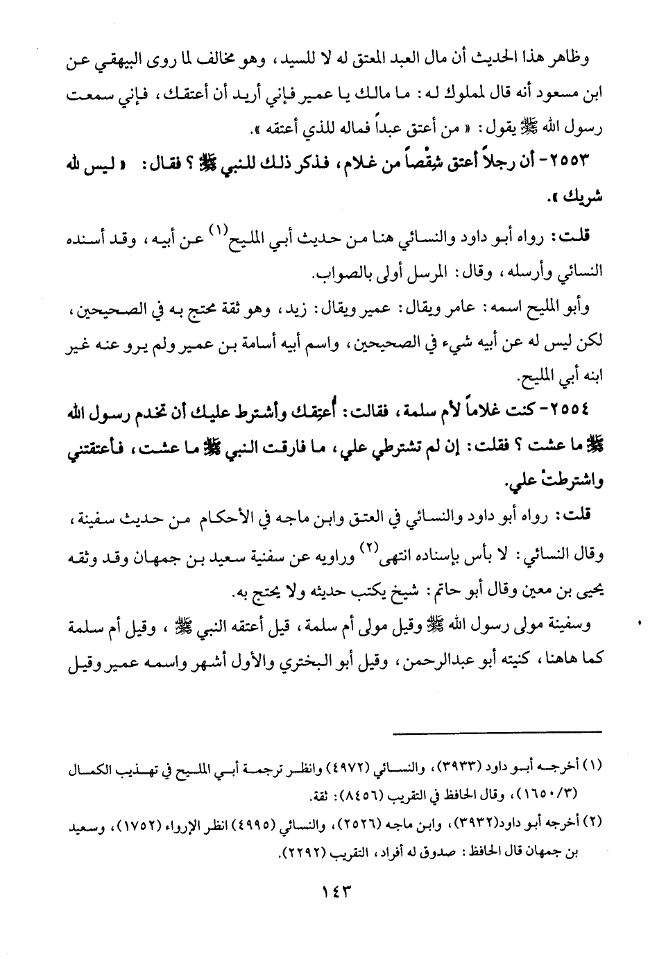 قلت: رواه أبو داود والنسائي في العتق وابن ماجه في الأحكام من حديث سفينة، وقال النسائي: لا بأس بإسناده انتهى (¬2) وراويه عن سفينة سعيد بن جمهان وقد وثقه يحيى بن معين وقال أبو حاتم: شيخ يكتب حديثه ولا يحتج به.
