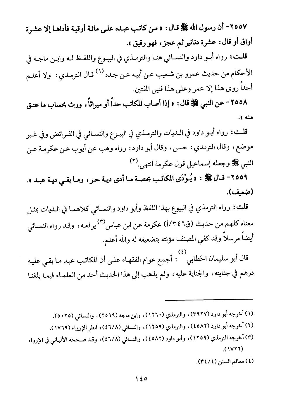 2559 - قال - صلى الله عليه وسلم -: "يُوْدَى المكاتب بحصة ما أدى دية حر، وما بقي دية عبد". (ضعيف).