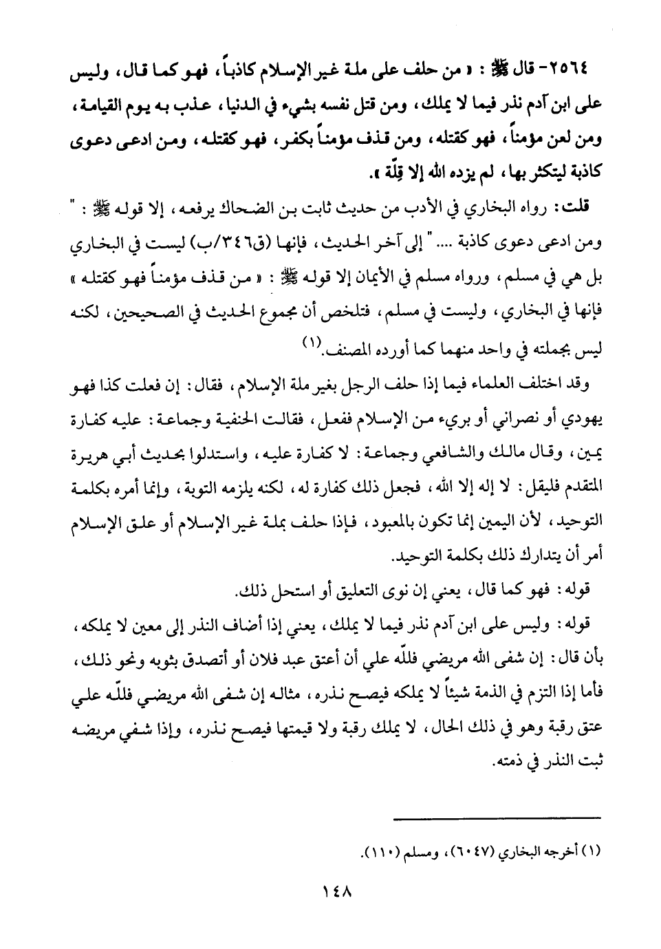 2564 - قال - صلى الله عليه وسلم -: "من حلف على ملة غير الإسلام كاذبًا، فهو كما قال، وليس على ابن آدم نذر فيما لا يملك، ومن قتل نفسه بشيء في الدنيا، عذب به يوم القيامة، ومن لعن مؤمنًا، فهو كقتله، ومن قذف مؤمنًا بكفر، فهو كقتله، ومن ادعى دعوى كاذبة ليتكثر بها، لم يزده الله إلا قِلَّة".