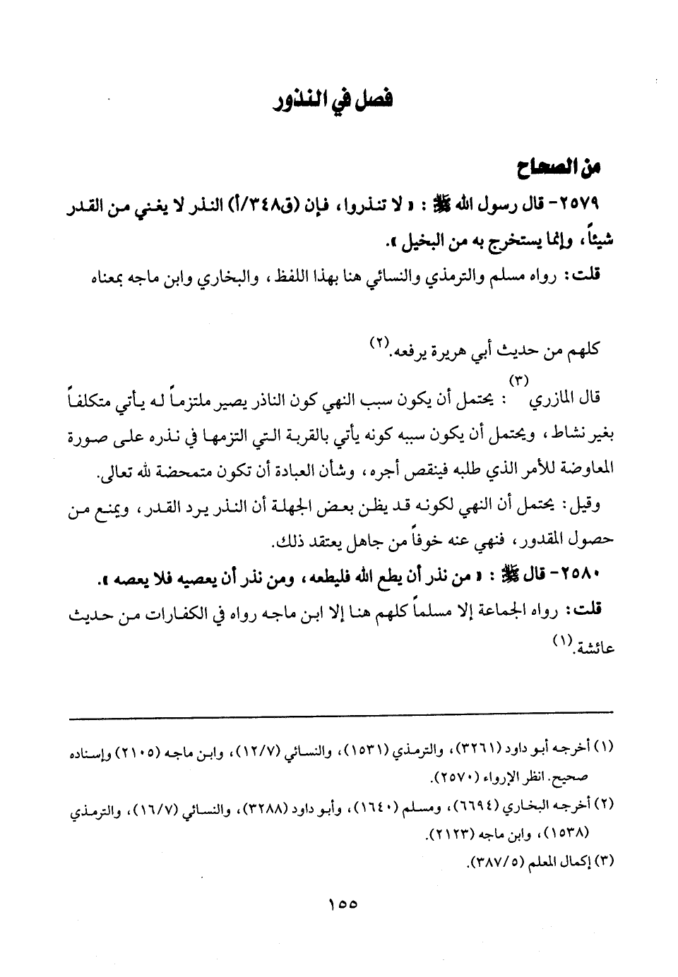 2580 - قال - صلى الله عليه وسلم -: "من نذر أن يطع الله فليطعه، ومن نذر أن يعصيه فلا يعصه".