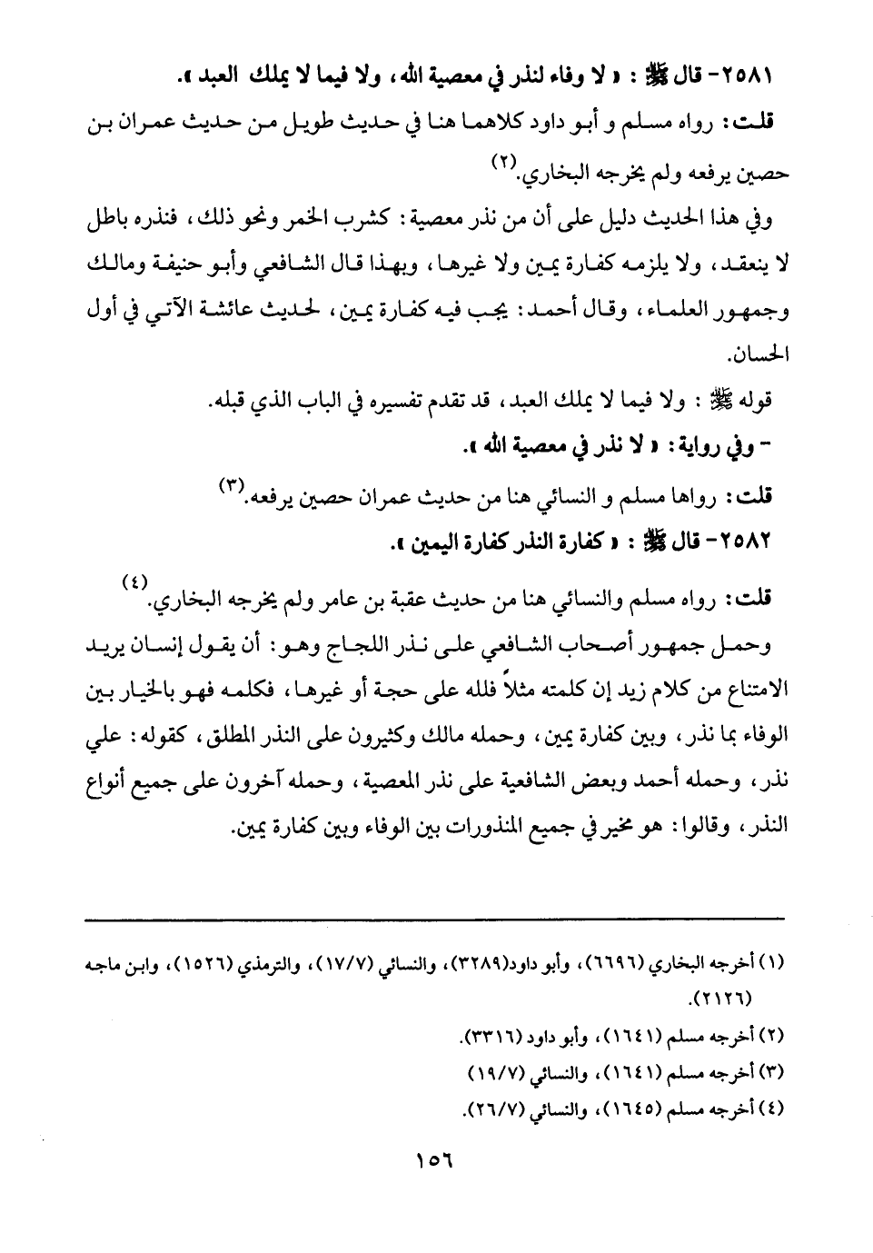 2581 - قال - صلى الله عليه وسلم -: "لا وفاء لنذر في معصية الله، ولا فيما لا يملك العبد".