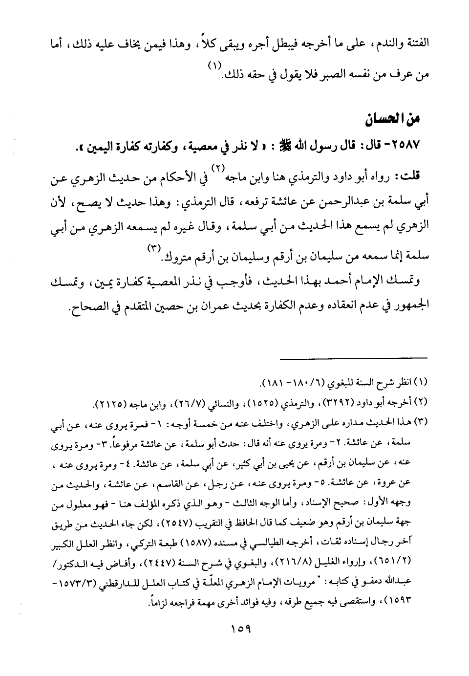 وتمسك الإمام أحمد بهذا الحديث، فأوجب في نذر المعصية كفارة يمين، وتمسك الجمهور في عدم انعقاده وعدم الكفارة بحديث عمران بن حصين المتقدم في الصحاح.