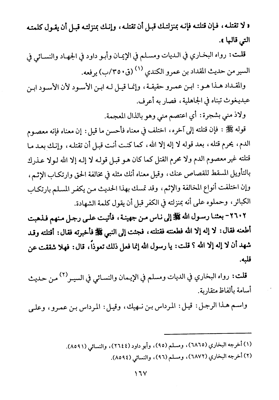 "لا تقتله، فإن قتلته فإنه بمنزلتك قبل أن تقتله، وإنك بمنزلته قبل أن يقول كلمته التي قالها".
