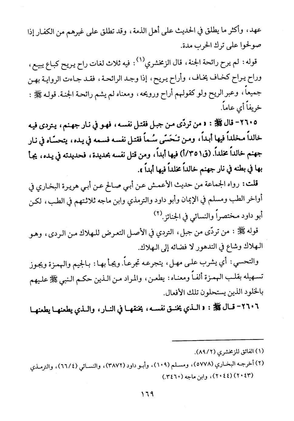 2605 - قال - صلى الله عليه وسلم -: "من تردّى من جبل فقتل نفسه، فهو في نار جهنم، يتردى فيه خالدًا مخلدًا فيها أبدًا، ومن تَحَسّى سُمًا فقتل نفسه فسمه في يده، يتحسّاه في نار جهنم خالدًا مخلدًا فيها أبدًا، ومن قتل نفسه بحديدة، فحديدته في يده، يجأ بها في بطنه في نار جهنم خالدًا مخلدًا فيها أبدًا".