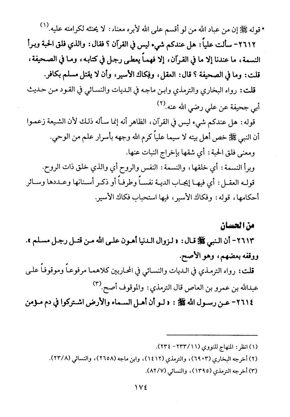 2613 - أن النبي - صلى الله عليه وسلم - قال: "لزوال الدنيا أهون على الله من قتل رجل مسلم". ووقفه بعضهم، وهو الأصح.